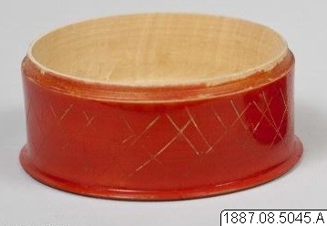 • Ask av trä, svarvad, rödlackerad med ristade vita, gula och gröna ornament. (generalkatalogen)