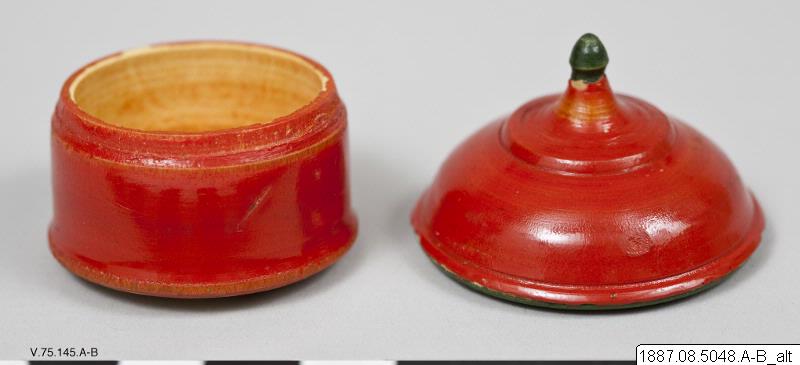 • Lock till ask av trä, rött med grön knopp.