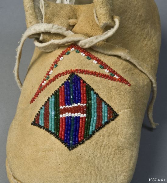 • Mockasin av ljustgult, rökt hjortskinn med pärlbroderi.