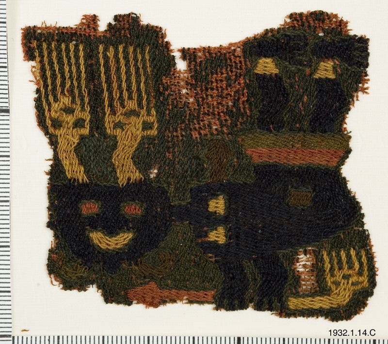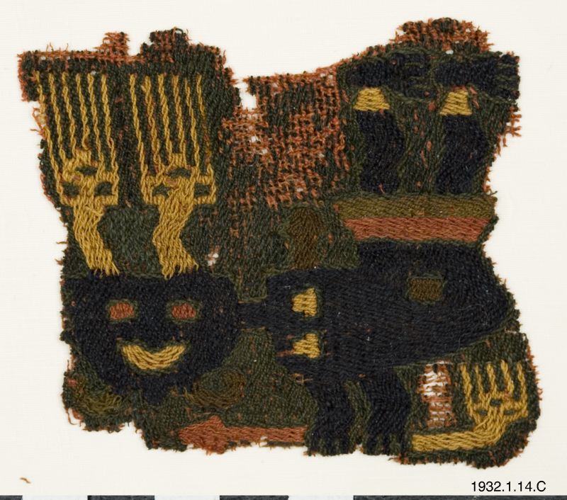 • Eventuellt fragment från Paracas-mantel; i s.k. ¿blockstil¿ med tuskaftvävd botten av rött ullgarn och helt täckande broderi av ullgarn med motiv av slingrig människo/getfigur med skägg, blå kropp gula händer/hår/huvuden ut från huvudet samt samma gula figur samt röd pil i händerna, på grön botten. Jämför med fragment omärkt 888, 896, 947, 948.