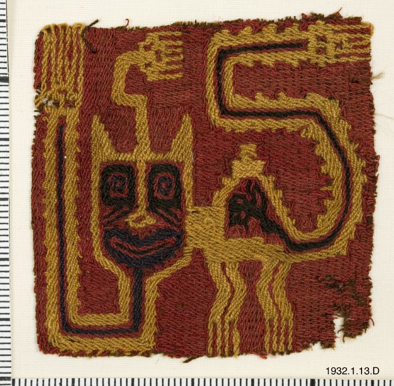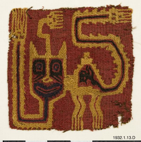 Eventuellt fragment från Paracas-mantel; i s.k. ¿blockstil¿ med tuskaftvävd botten i bomull och helt täckande stjälkstygns broderi av ullgarn med motiv av kattfigur med gul kropp och mörkbruna detaljer inuti, på röd botten. Jämför med fragment omärkt 890, 895, 898, 946.