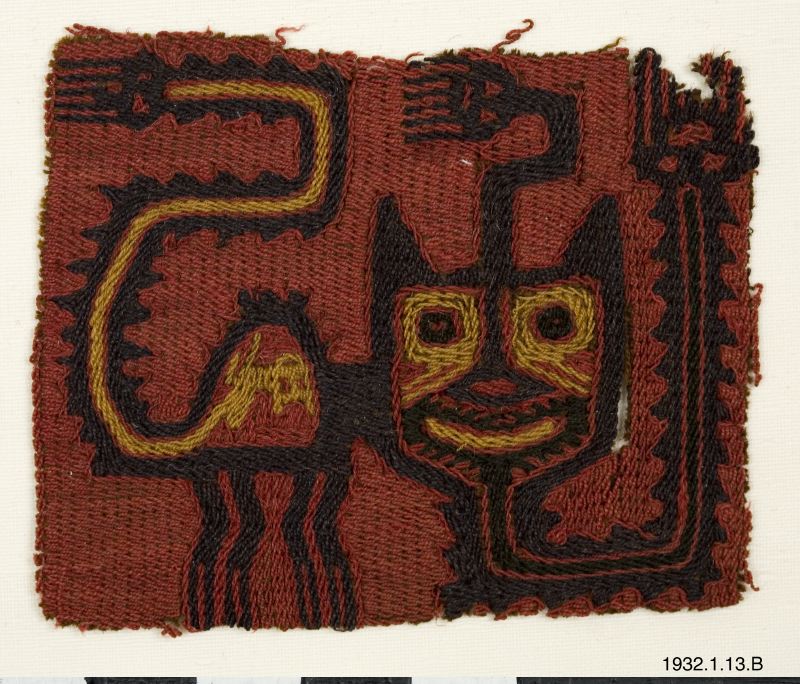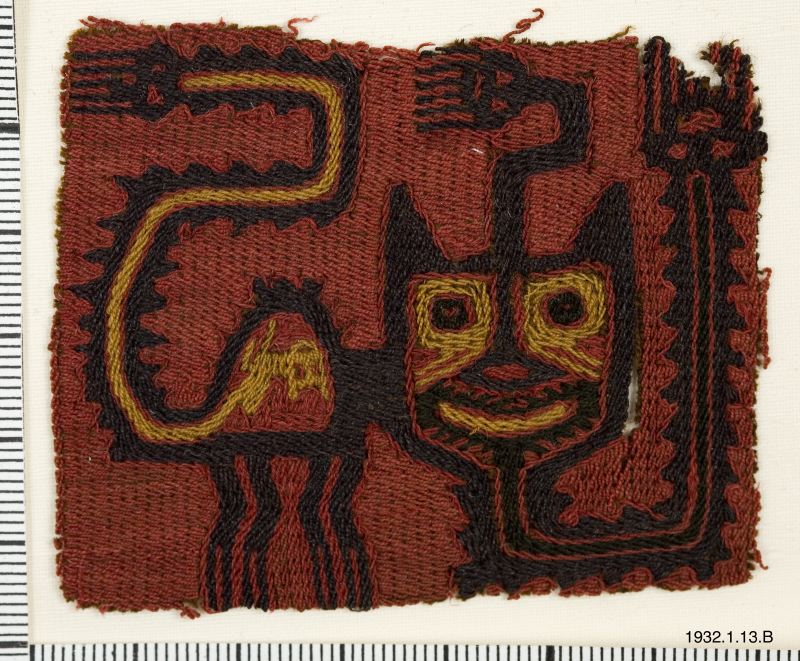 Eventuellt fragment från Paracas-mantel; i s.k. ¿blockstil¿ med tuskaftvävd botten av bomull och helt täckande stjälkstygns broderi av ullgarn med motiv av kattfigur med mörkbrun kropp och gula detaljer inuti, på röd botten. Jämför med fragment omärkt 891, 895, 898, 946.