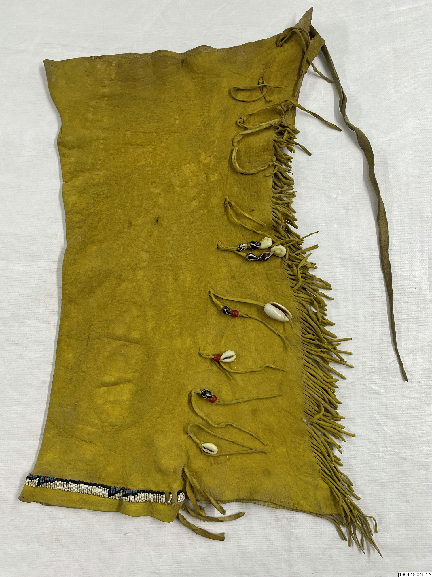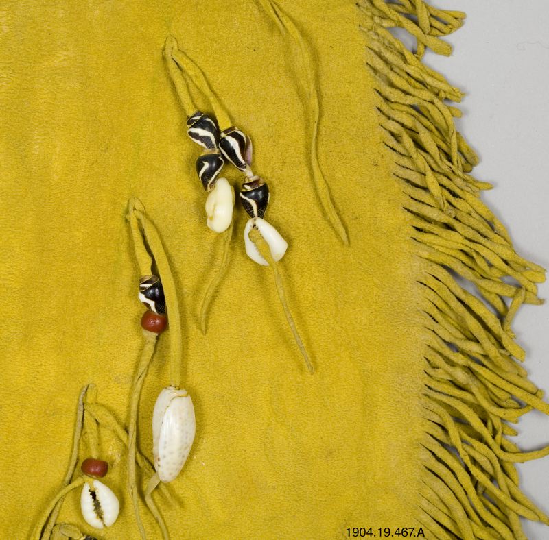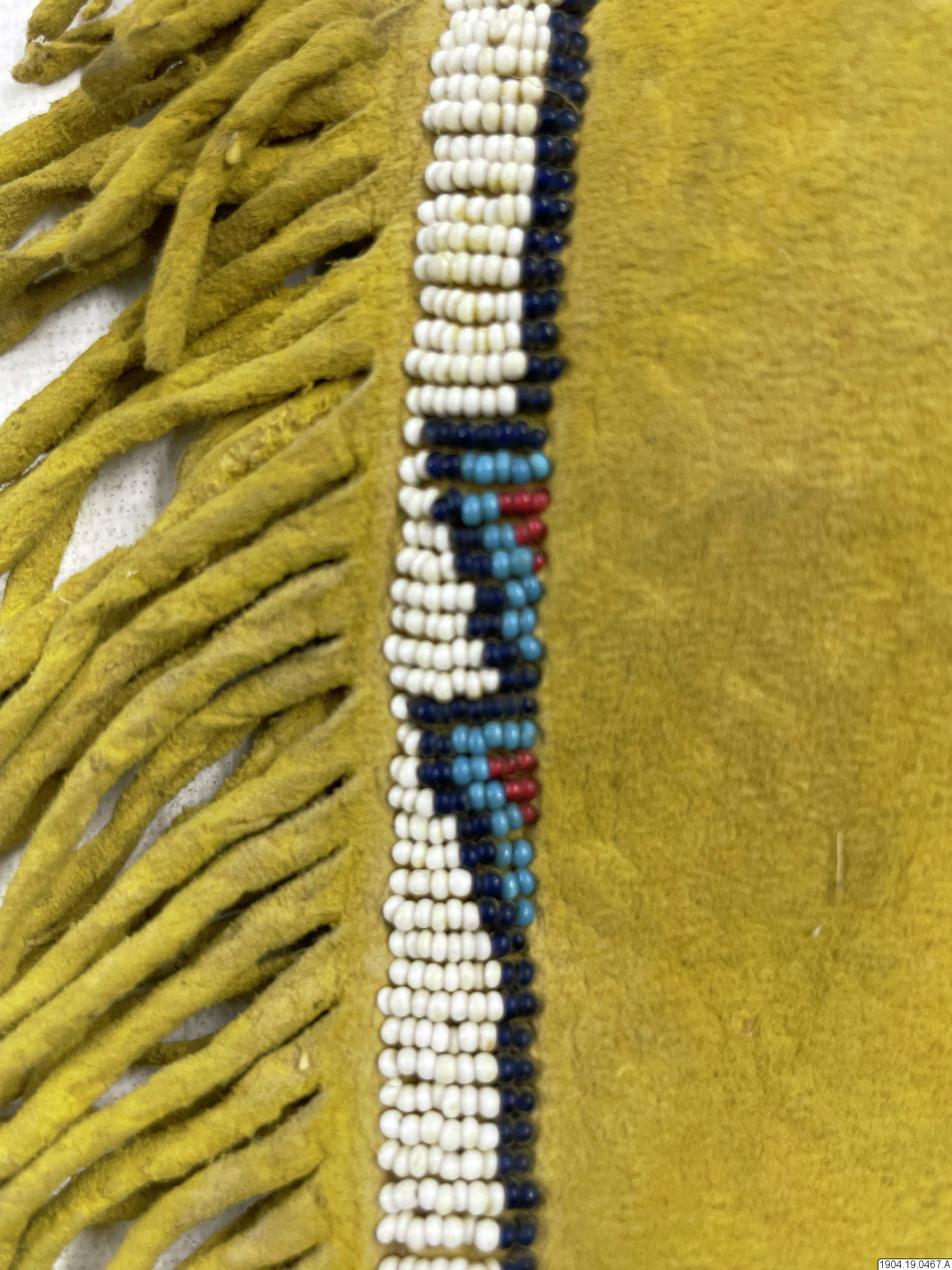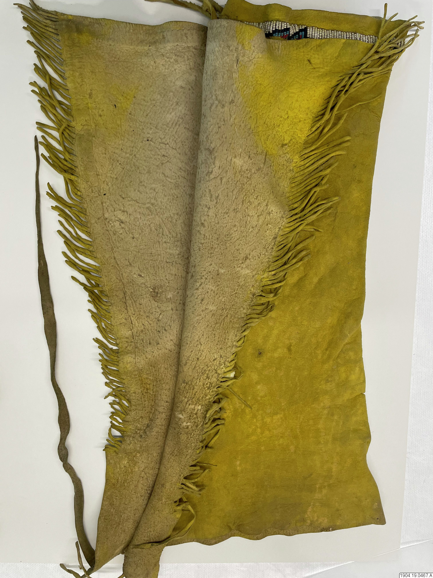 En av ett par benkläder av gulfärgat skinn. Fransar längs yttersidan. Läderremmar för fastgörning. Broderad med glaspärlor i blått och vitt. Dekorerad med tofsar med snäckor, röda glaspärlor och runda metallkulor.