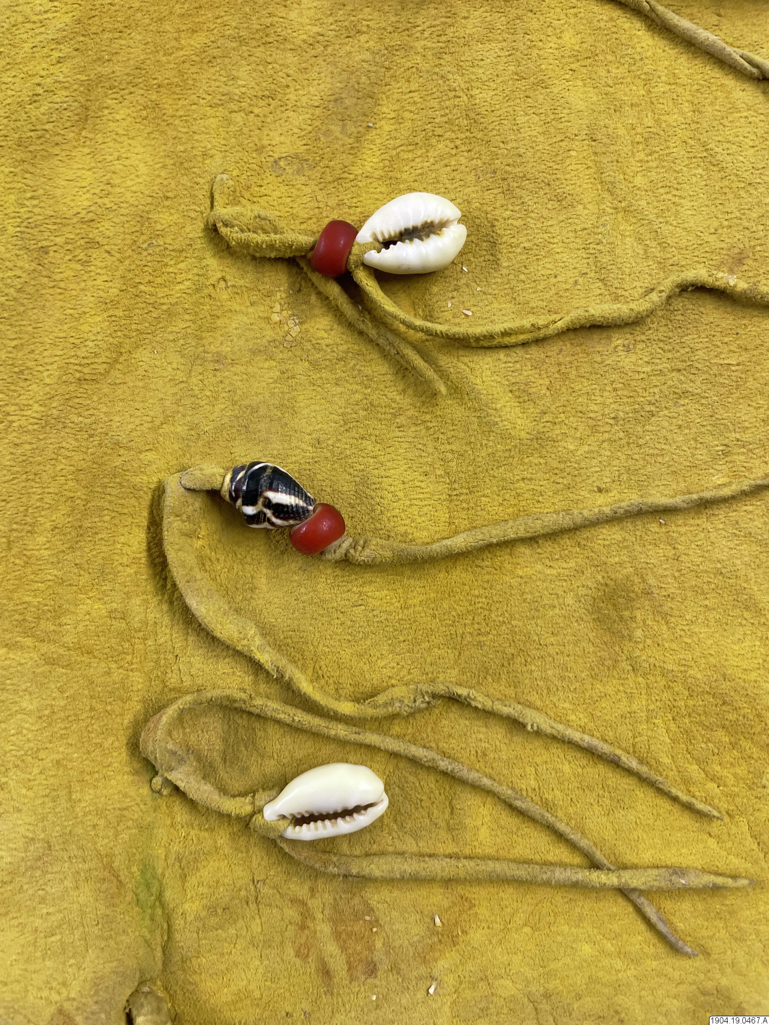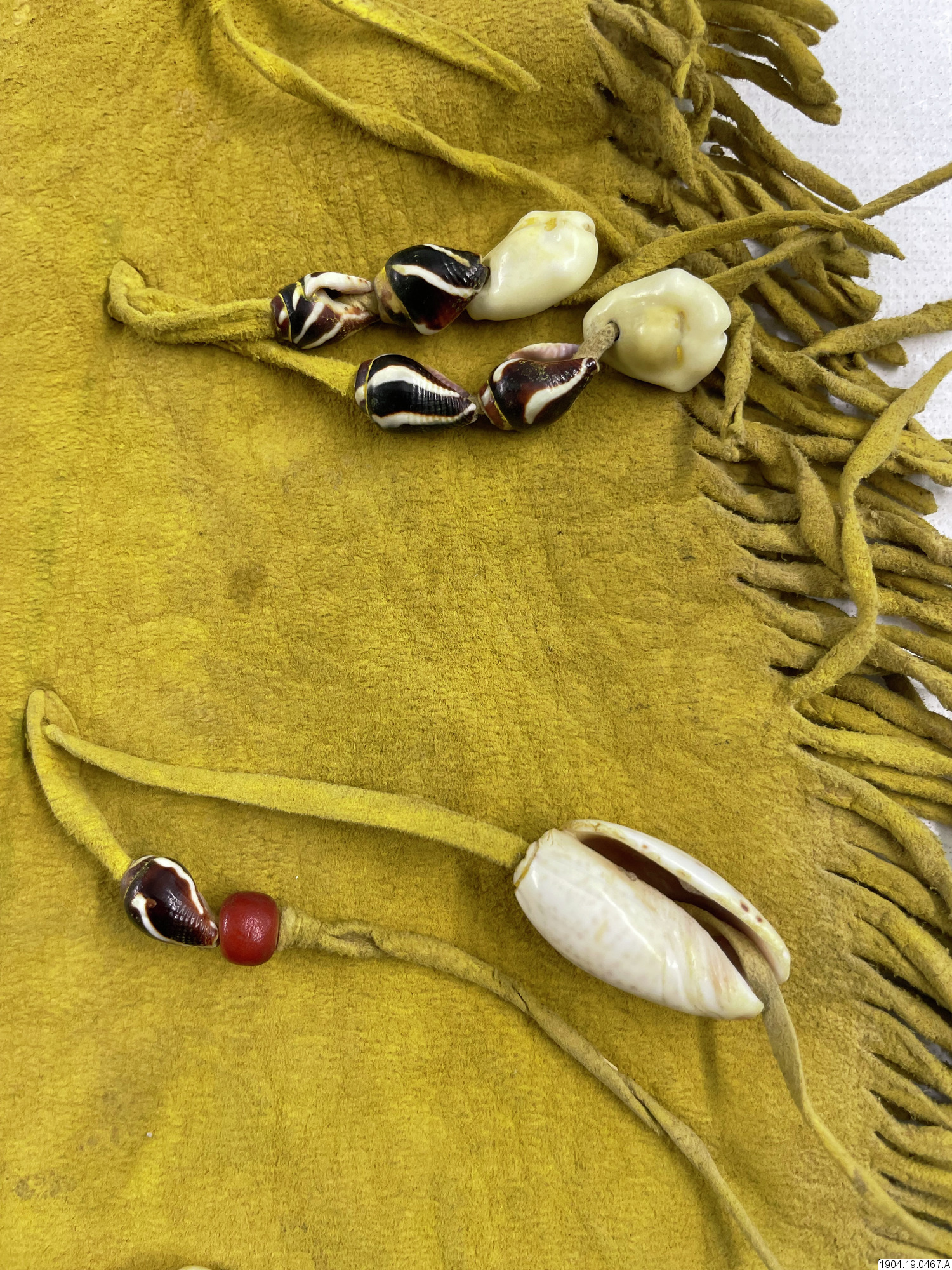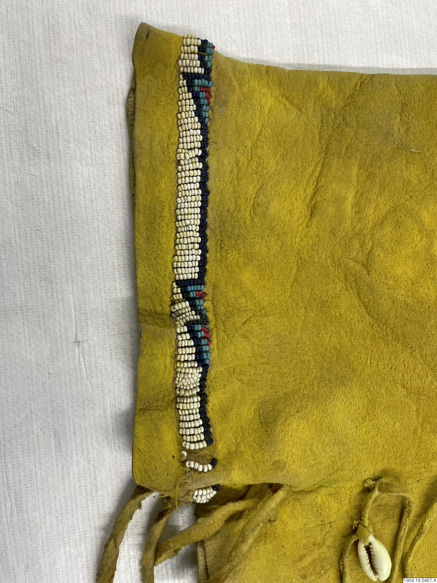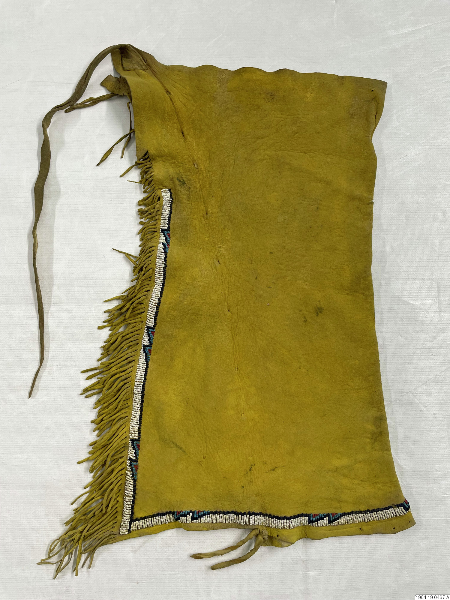 En av ett par benkläder av gulfärgat skinn. Fransar längs yttersidan. Läderremmar för fastgörning. Broderad med glaspärlor i blått och vitt. Dekorerad med tofsar med snäckor, röda glaspärlor och runda metallkulor.