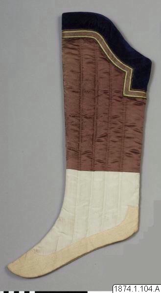 • Sockorna är sydda av beige bomullstyg, vadderade och har längsgående stickningar. De är förstärkta i sulan med små stygn.