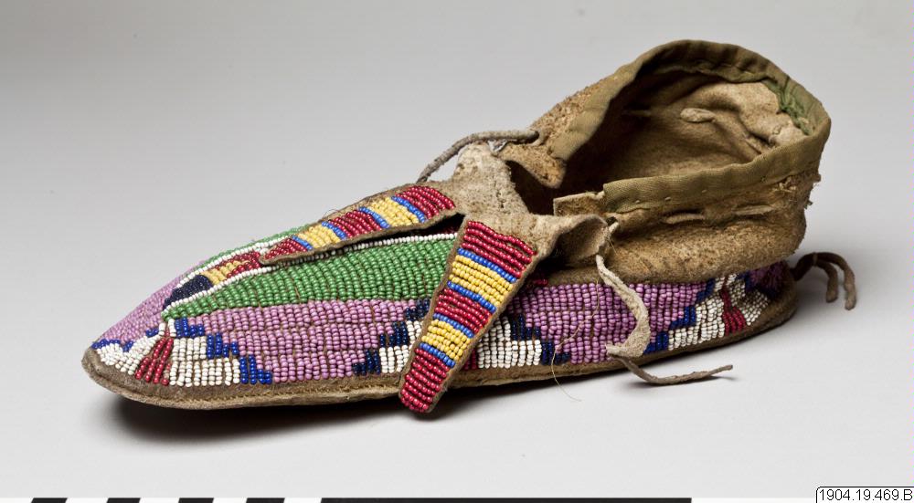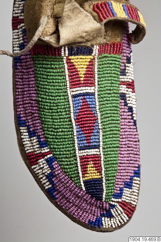 Mockasin av skinn med pärlbroderier över hela skodelen samt på de båda tvåtungade plöserna, del av par. Kanten mot vristen kantad med grönt bomullsband.