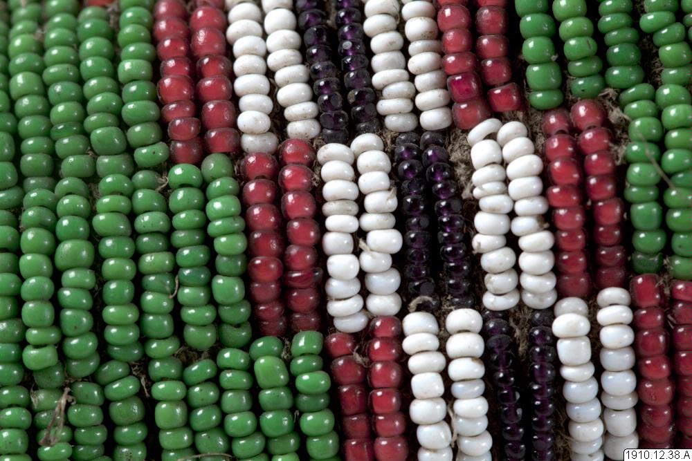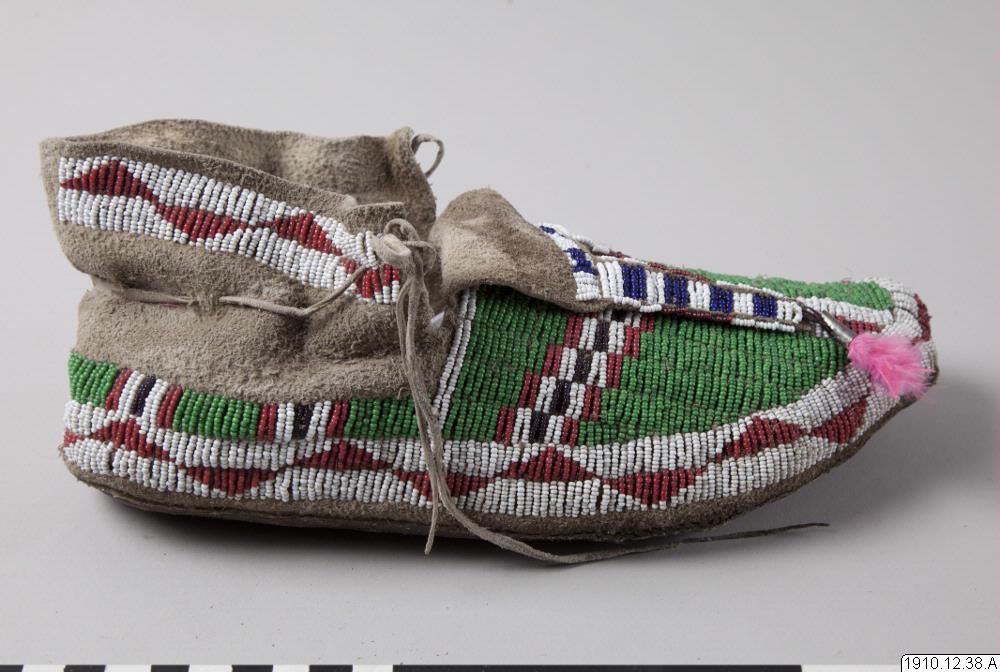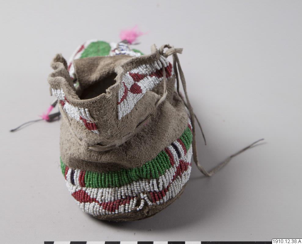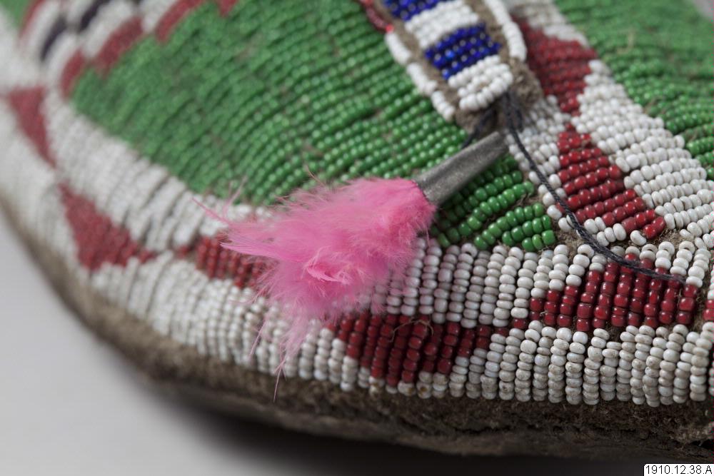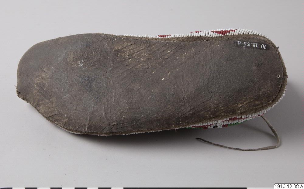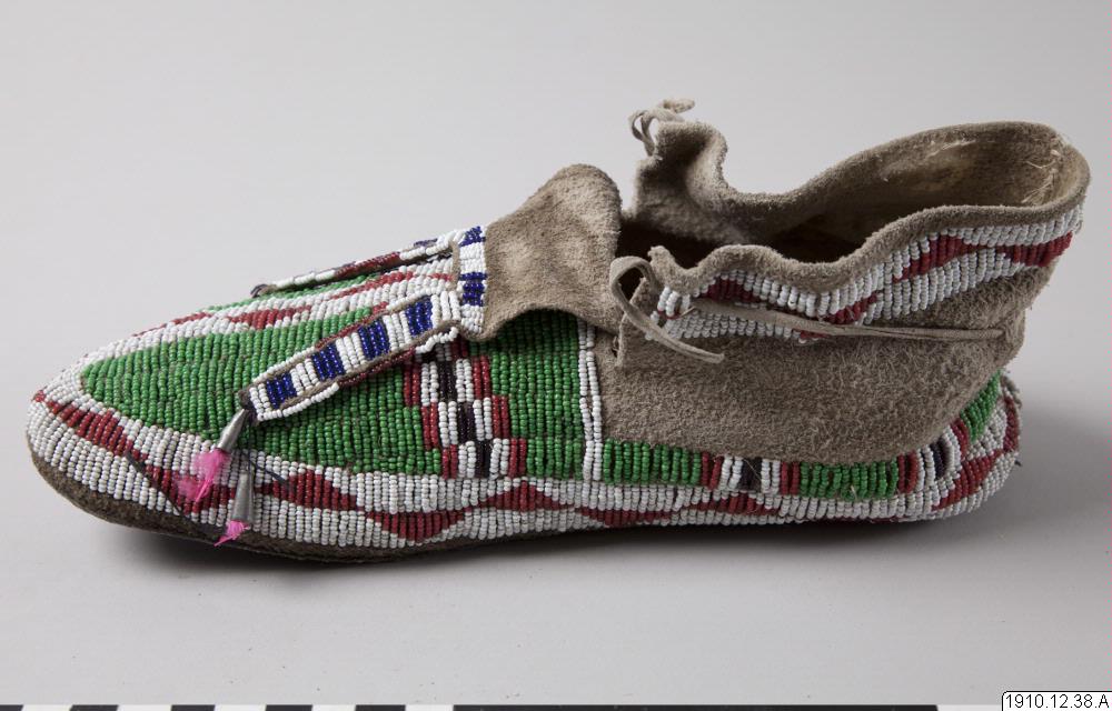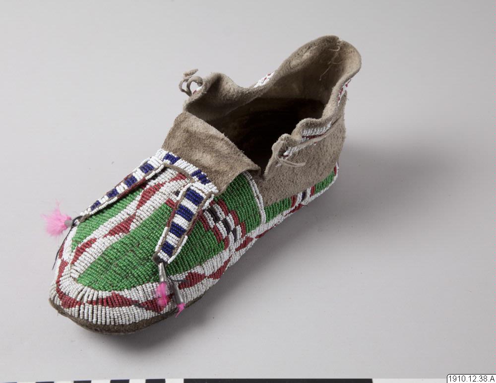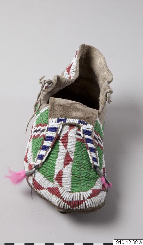 Mockasin, del av par. Av ljust skinn med pärlbroderier på ovansidan av mockasinen, hälkappan, samt på slejfen. Glaspärlor i vitt, rött, grönt och blått. Längst ut på slejfen tre metallkoner vari rosa fjädrar är fästade.