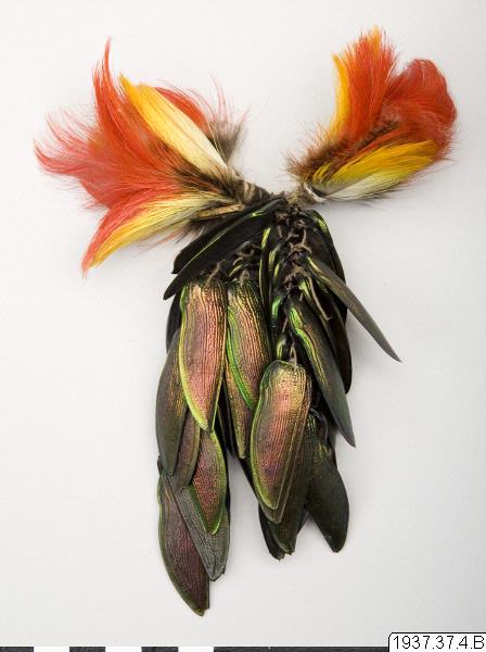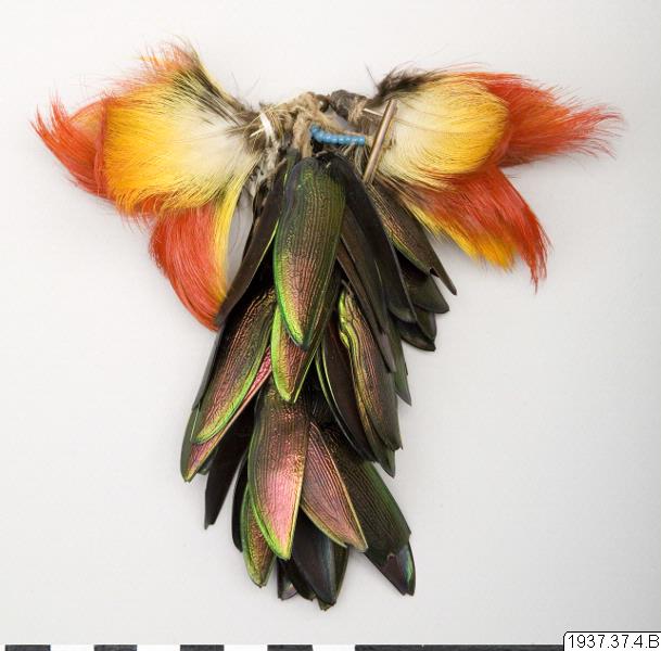 Öronprydnad, del av ett par. Utgöres av 2 gula och röda fjädervippor samt 3 hängen av skalbaggsvingar. De senare är av ett annat slag, skiftande i rött och grönt samt större. (generalkatalogen)
