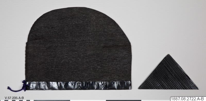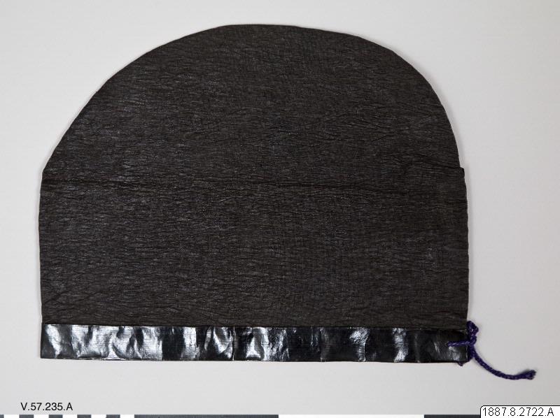 • Huvudbonad av tunt svart tyg. Svart lackerad kant. Hör till dräkten V.57.226. dvs 1887.8.2714.