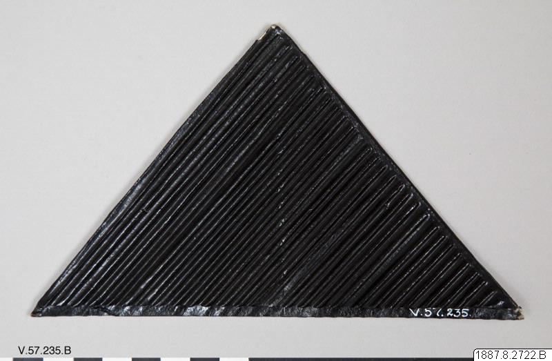• Huvudbonad av tunt svart tyg. Svart lackerad kant. Hör till dräkten V.57.226. dvs 1887.8.2714.