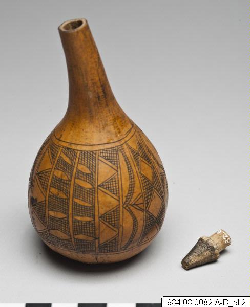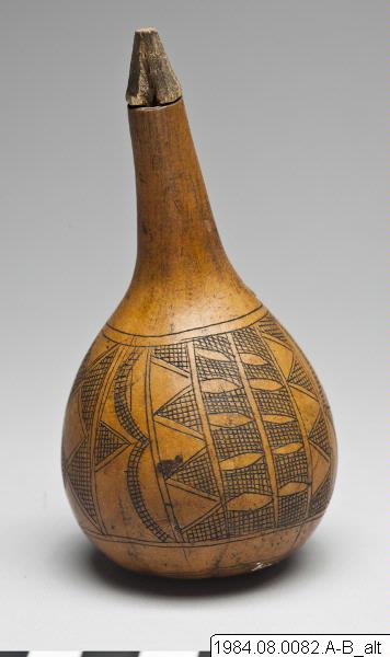 Rund botten, avsmalnande lång hals. Inristade ornament: trekanter, rutor, allt längs med kalebassen, dock ett begränsat område på kalebassens mitt. Från mitten upp på halsen: en pil.
