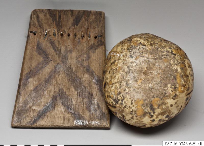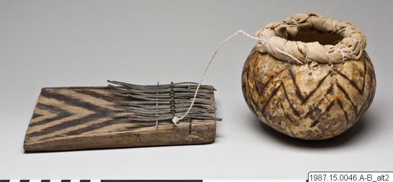 Ett kalebasskärl är fastbundet till musikinstrumentet 1987.15.46.A. Runt mynningen är ett tygstycke fastbundet.Kalebassens utsida är dekorerad med ett geometriskt mönster, samma dekor återfinns på musikinstrumentet. (mibo)