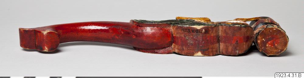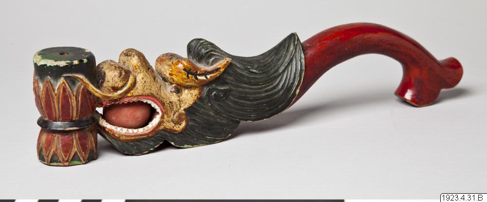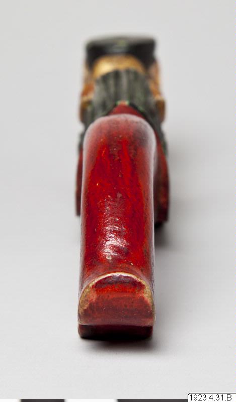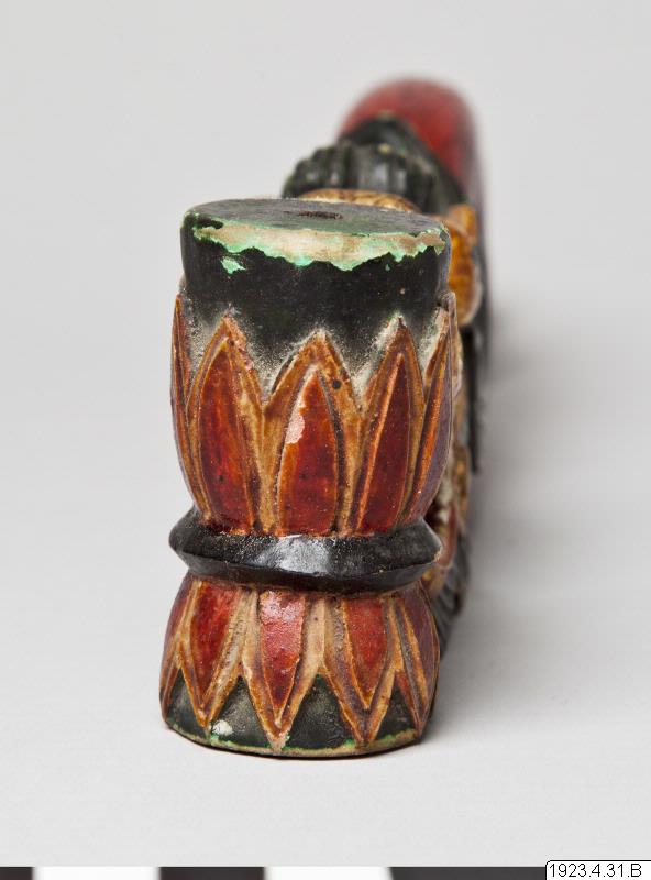 • Snidad drake, bemålad, i gapet en kula. Troligen rökelsehållare.