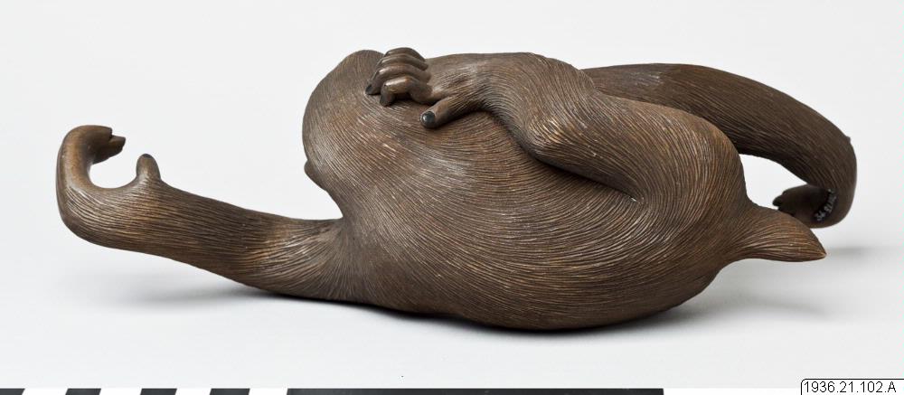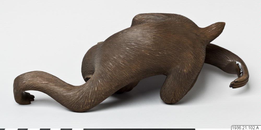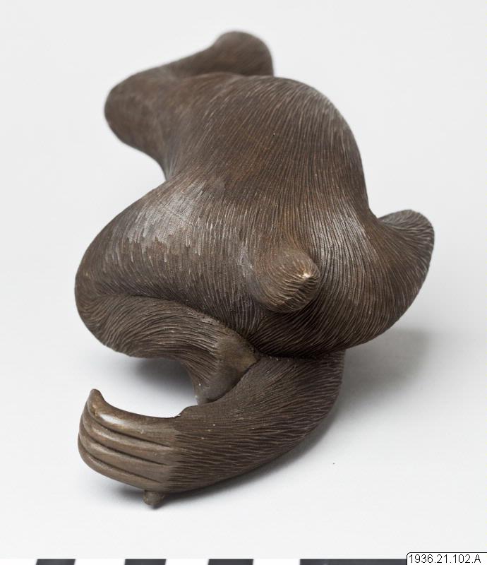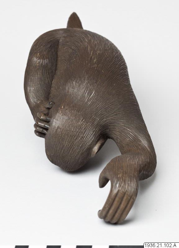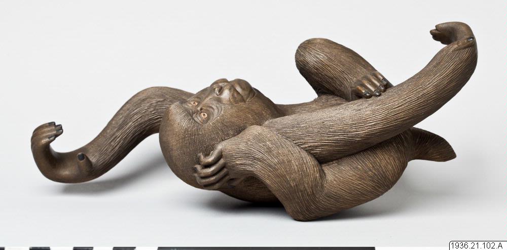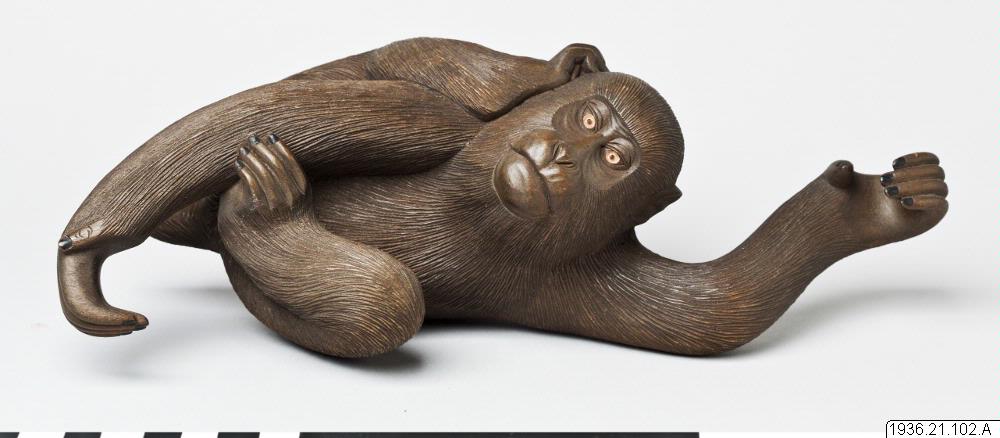 • Skulptur av trä, en apa som hänger i vänster arm och håller höger hand för ena örat.