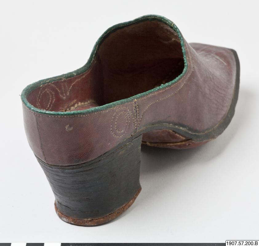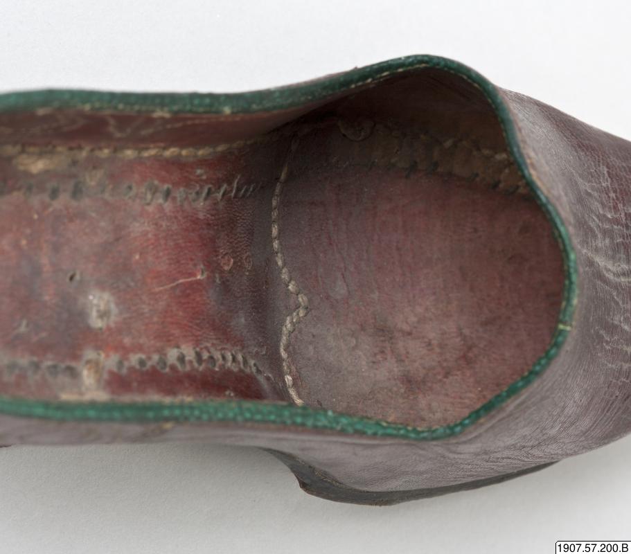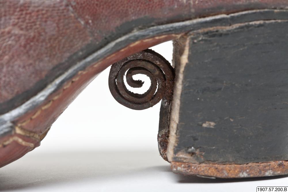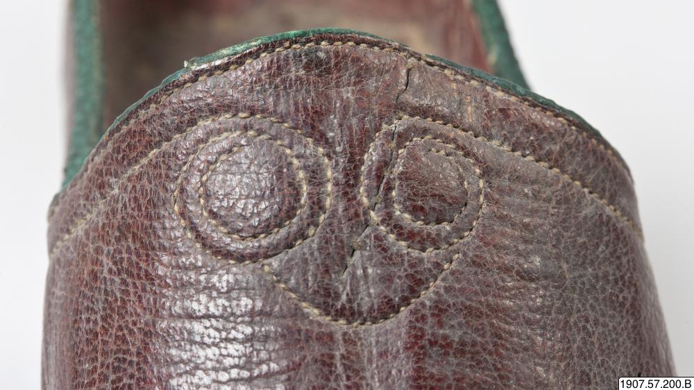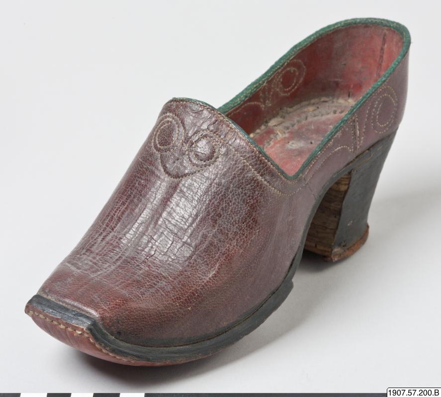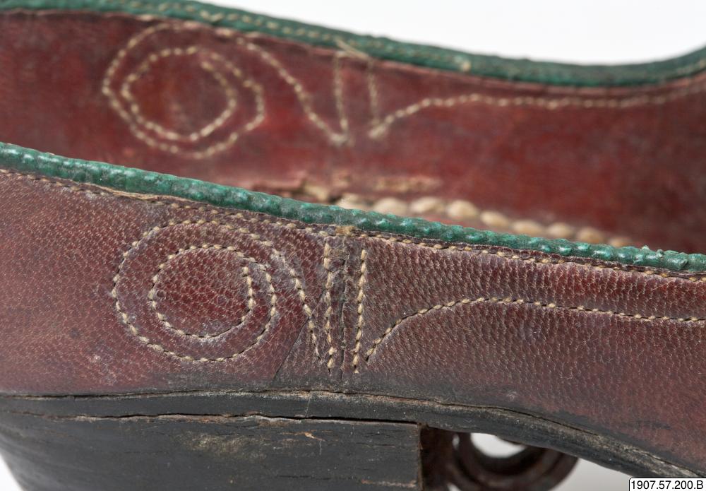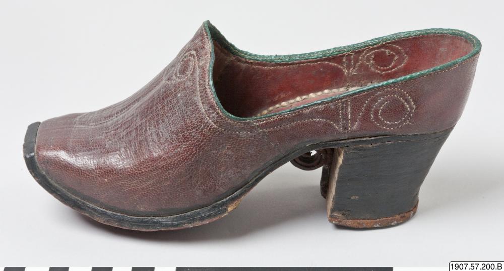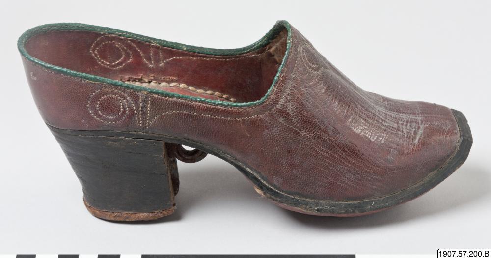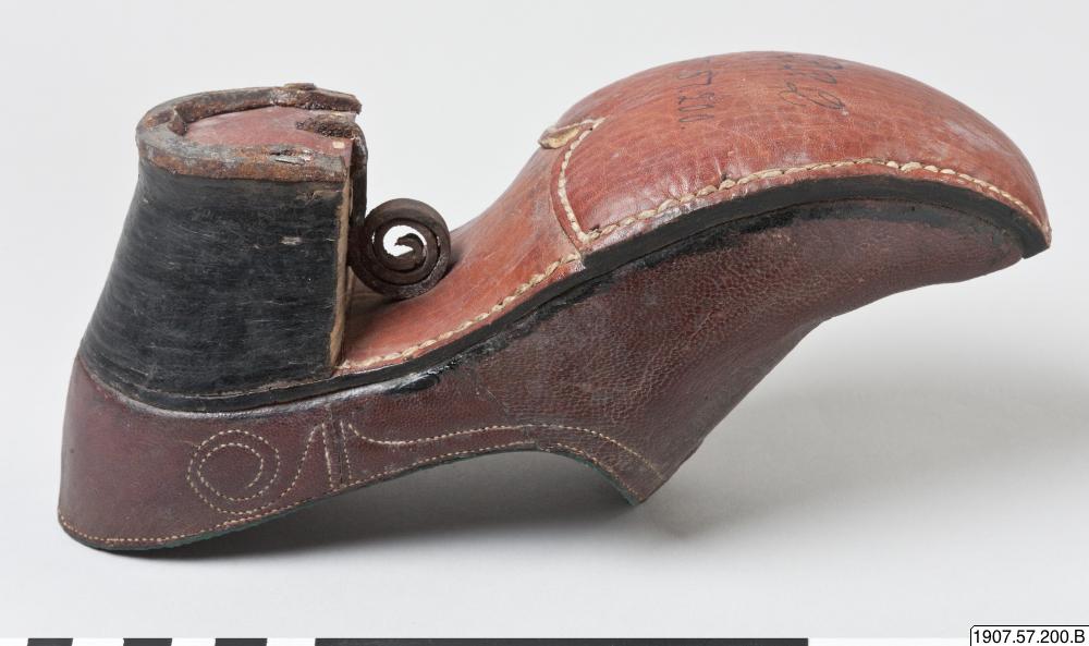 Fruntimmersstövlar med galoscher enl.katalog.( nr. 199-200) Detta nr. galoscherna. En brun skinnsko med klack, dekorativa stickningar, klackjärn med en lustig knorr på järnets avslutning. En högskaftad stövel med nätt fot, stoppas i denna sko. Se även 2.8.16, o.m.1905. för liknande stövlar.
