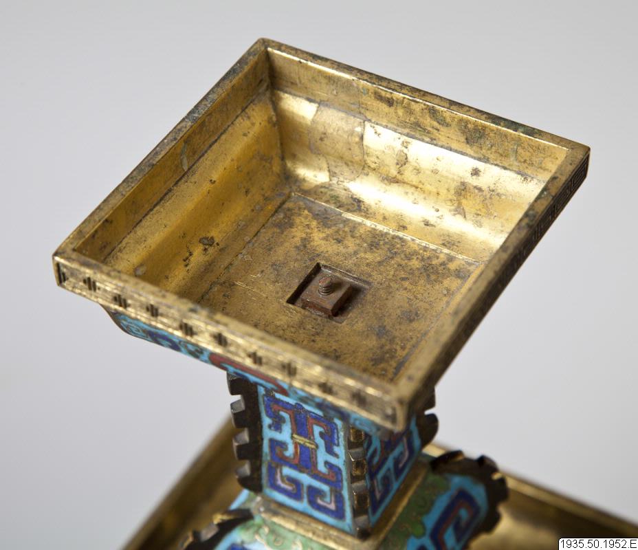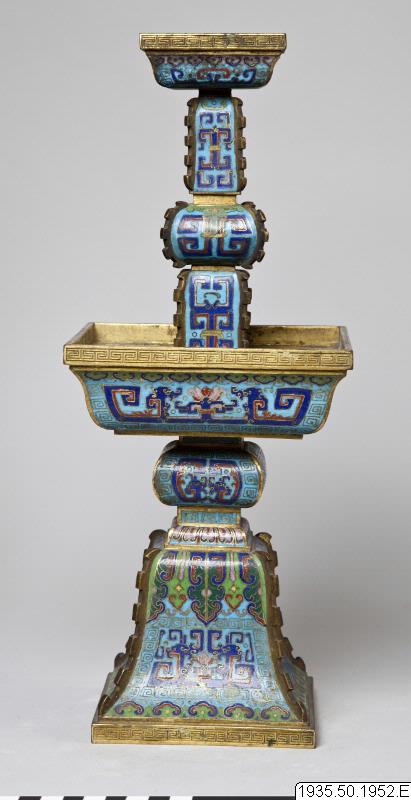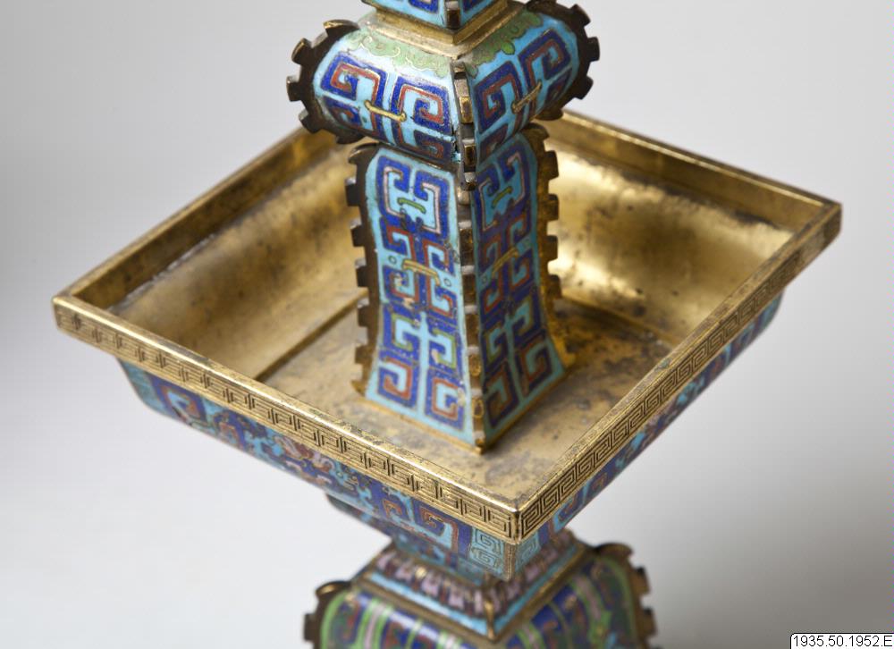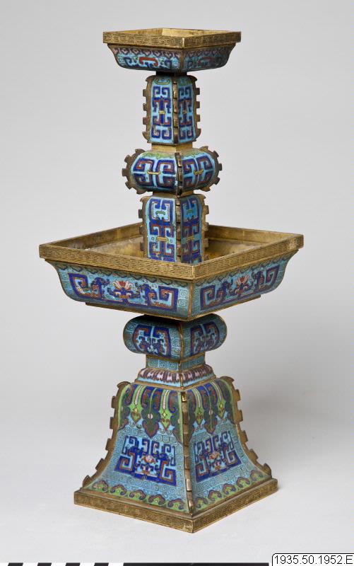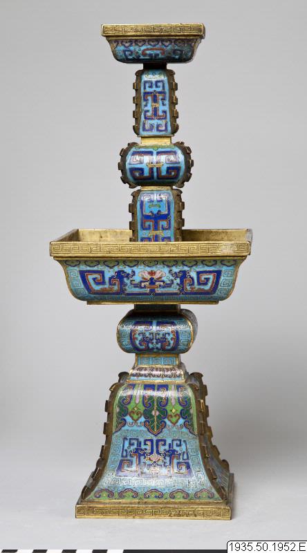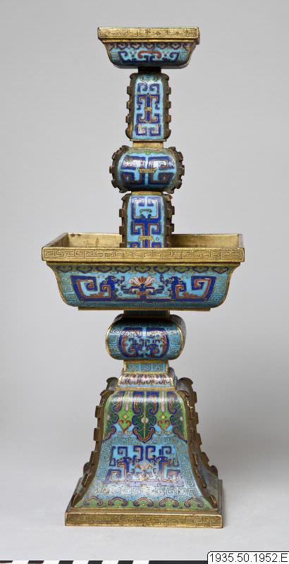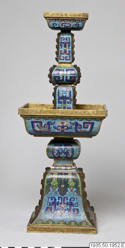 • Ljusstake, rikt dekorerat i färgerna blått, rött och guld, i cloisonné-teknik.