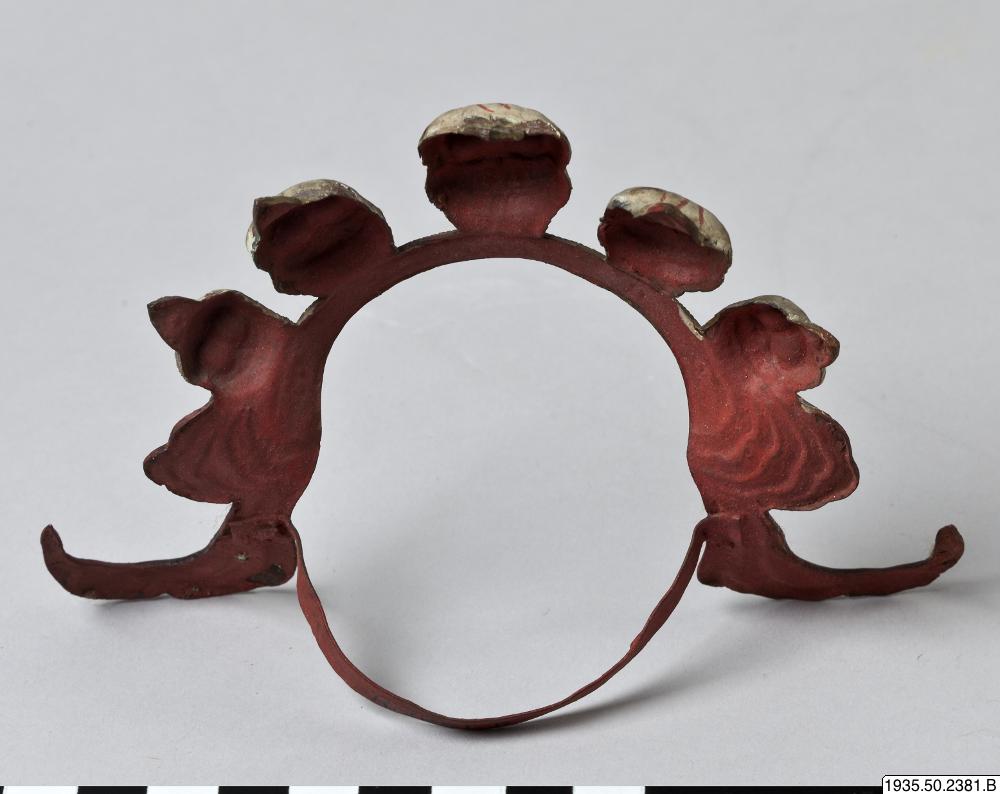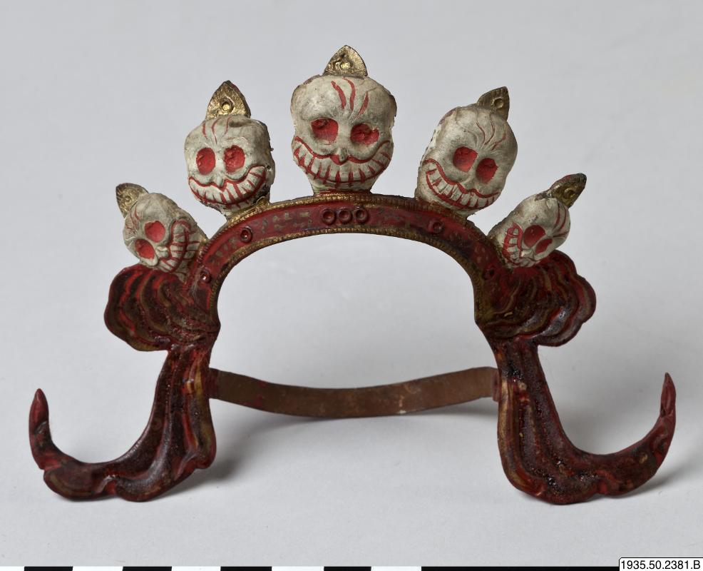 En skallkrona med 5 skallar, vitmålade, mun och ögon är rödmålade. Bandet som går ner i skulpturens panna ska troligen vara dekorerad med 7 koraller och turkoser. Alla stenar saknas, endast infattningarna finns. Bandet är rödmålat med gulddetaljer.