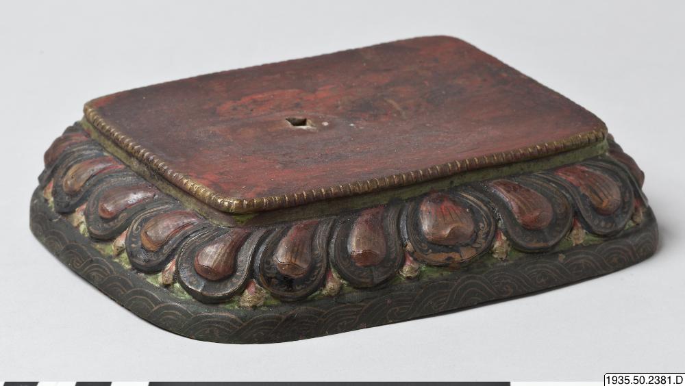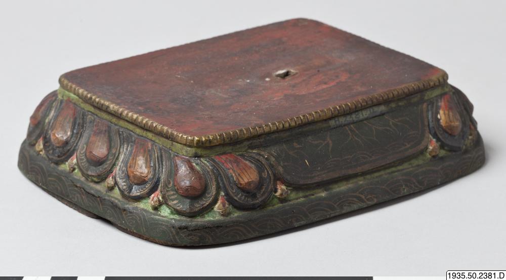 • Enkel mörkgrön lotussockel med röda kronblad och röd ovansida med tecknade fladdermöss, molnformationer och lyckotecken i guld.