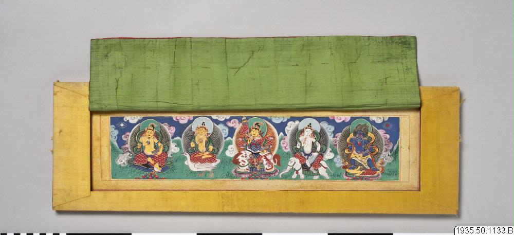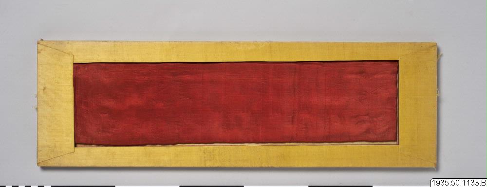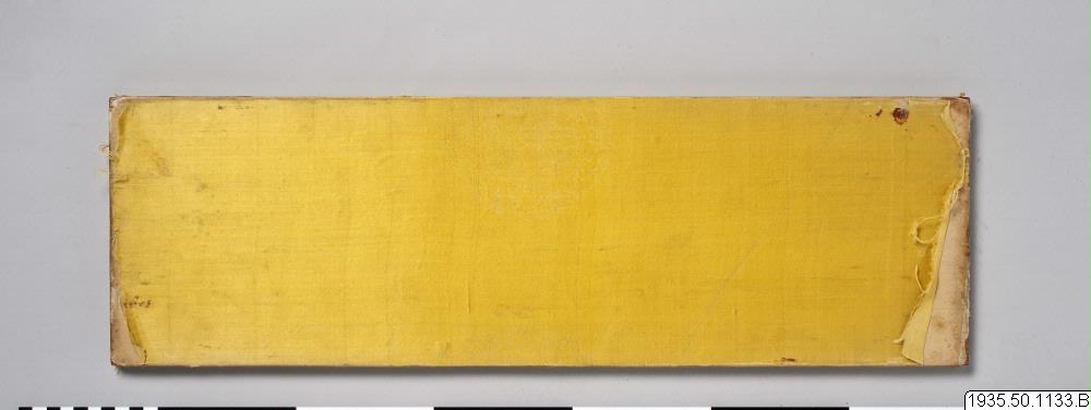 Undre pärm till bok. På insidan under ett draperi finns fem stycken figurer avbildade. Pärmen är klädd med gult sidentyg på vilken det finns ett tryckt mönster, en drake?