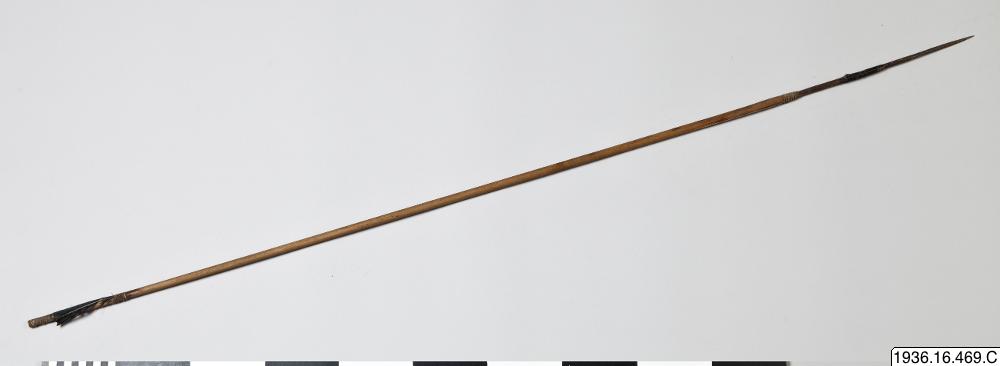 • Pil med rörskaft och spets av metall. Styrfjädrar.