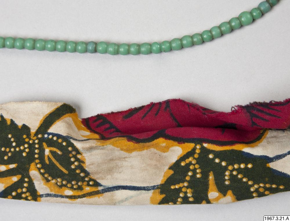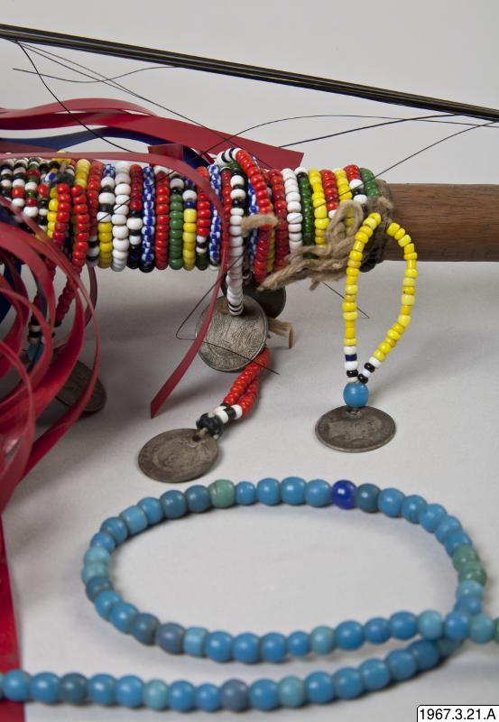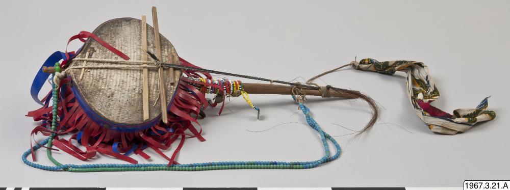 • Stränginstrument med stråke. Halv kalebass överdragen med reptilskinn som resonanslåda. Hals av trä. Resonanslådan prydd med röda och blå plastfransar, fästade med mässingsknappar. Runt halsen glaspärlor och engelska och franska silvermynt. Sträng av tagel. Serahuli: Njanjero. Längd: 52 cm, diam. 18 cm. (generalkatalogen)