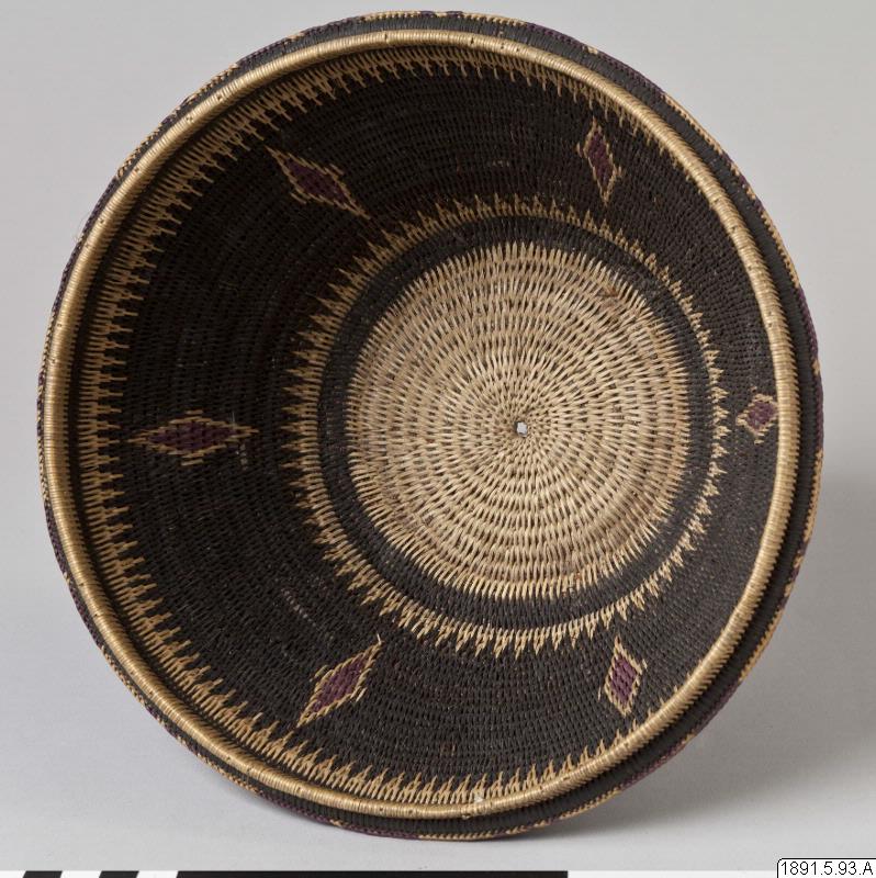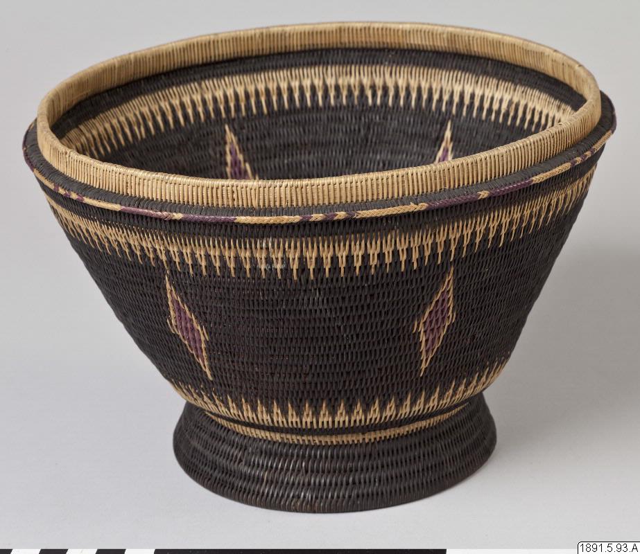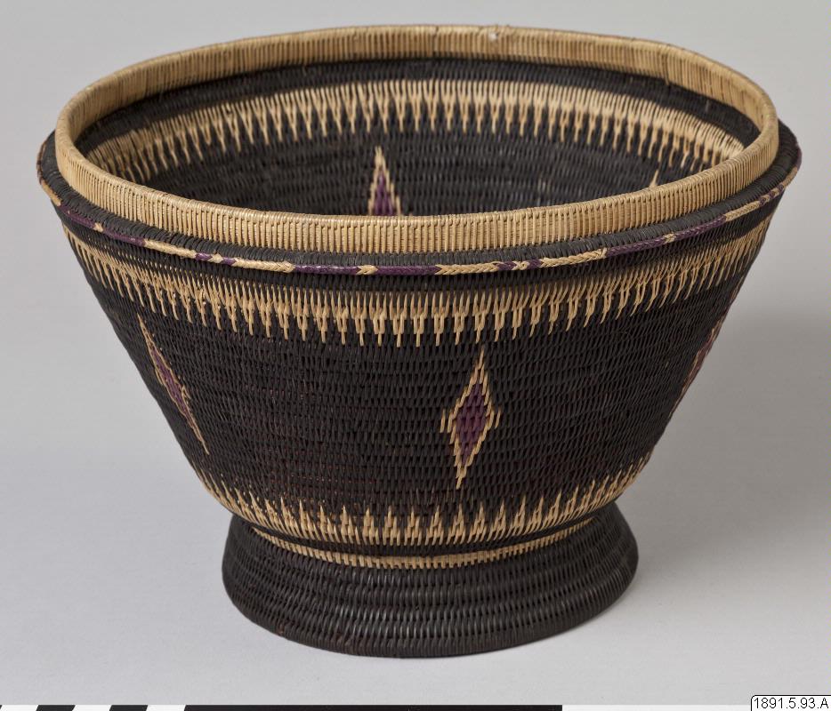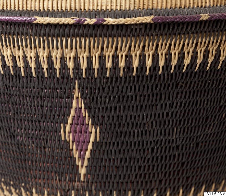 • Korg av flätad växtfiber, dekorerad med lila diamanter på svart bakgrund.