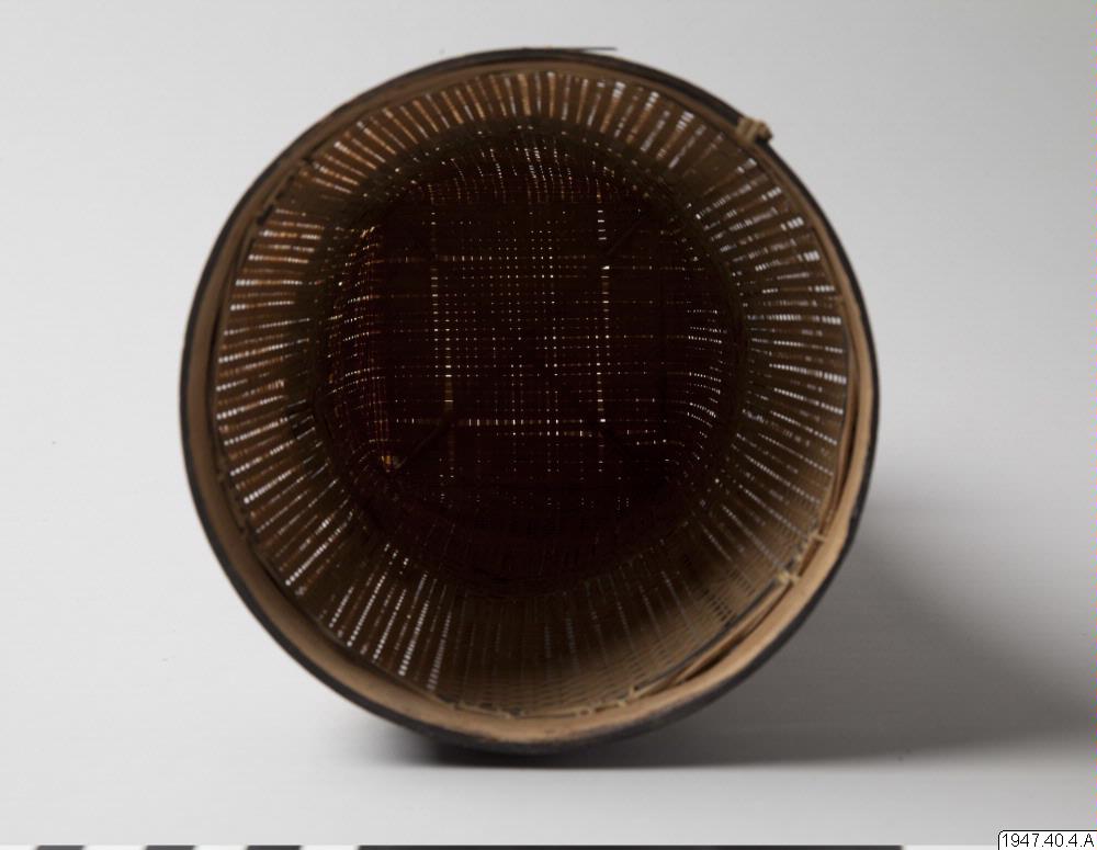 • Korg av flätad växtfiber, enkel banddekor. Inflätat rött band.