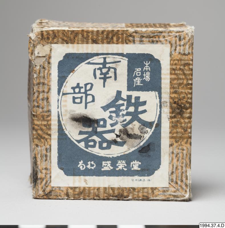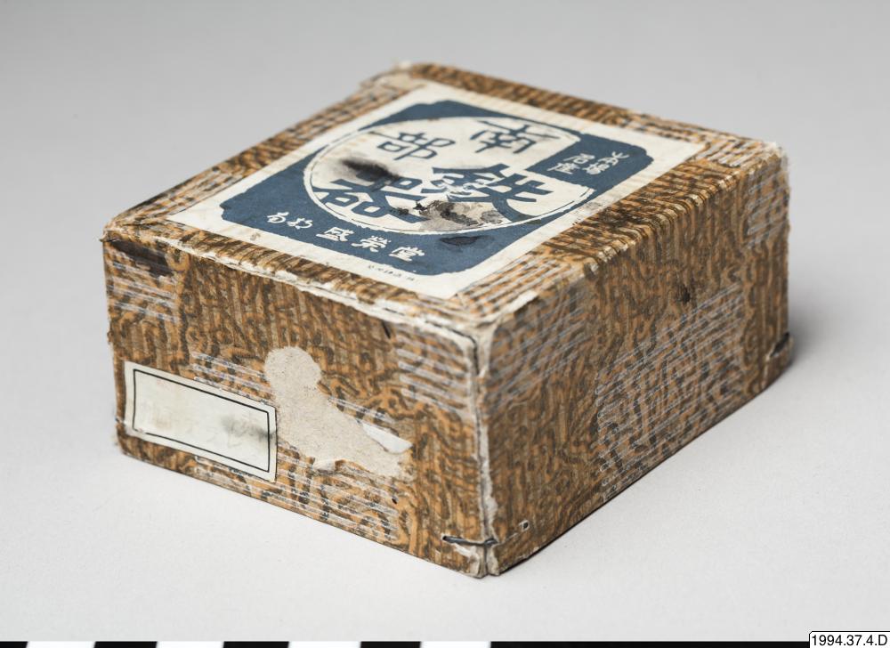• Lock till kartong. Tryckt dekor i blått och guld. Ovanpå locket en vit och blå etikett med skrift.