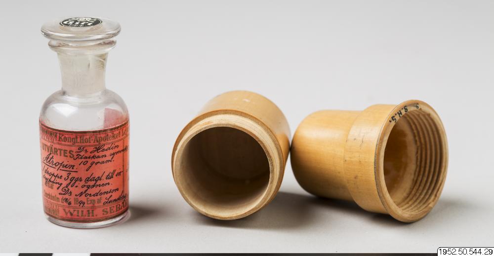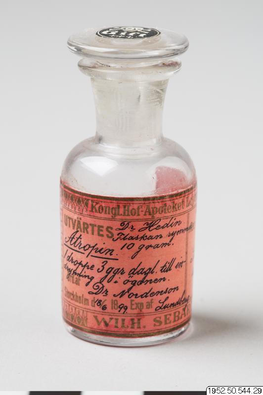 Innehåll enligt etikett: Gift. Atropin en droppe 3 ggr dagligen till indryftning i ögonen. Solut. Sulphat. Atropici 0,10: 10