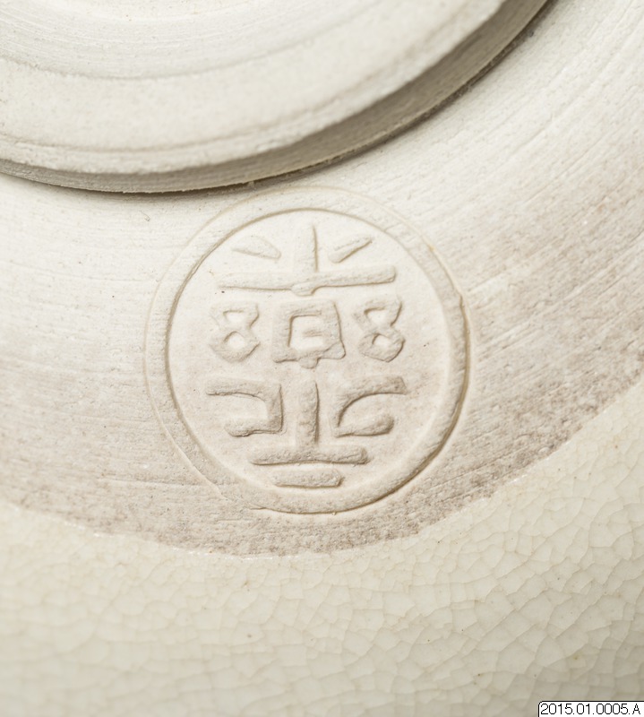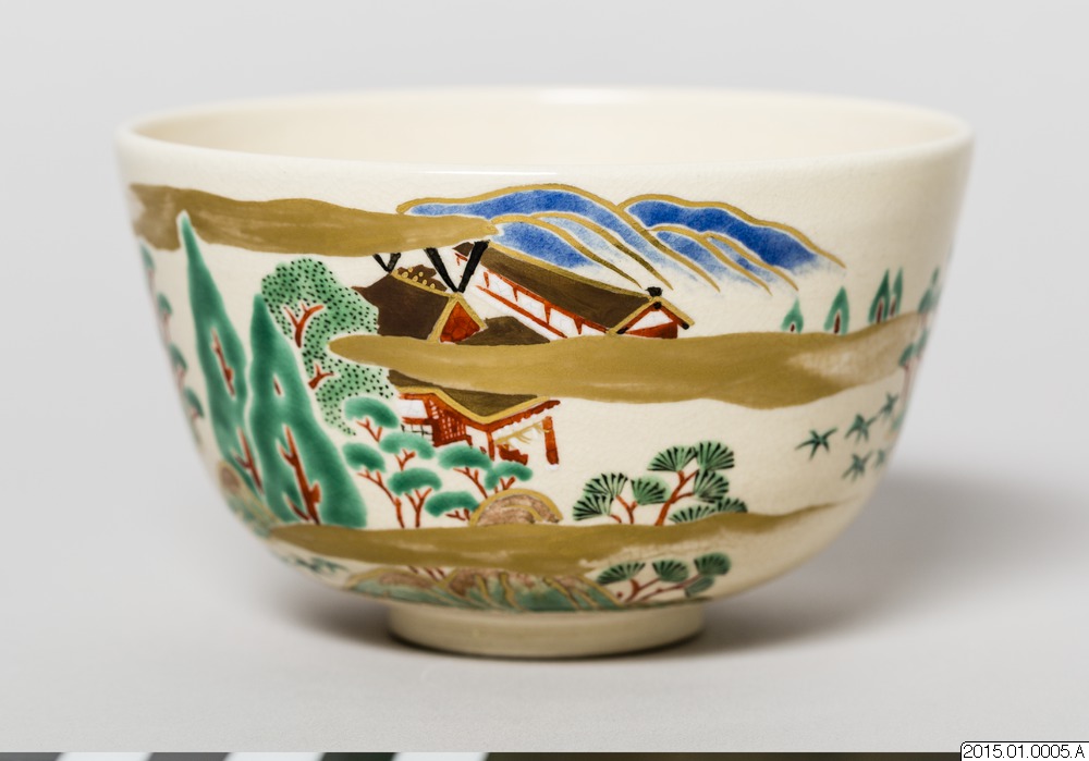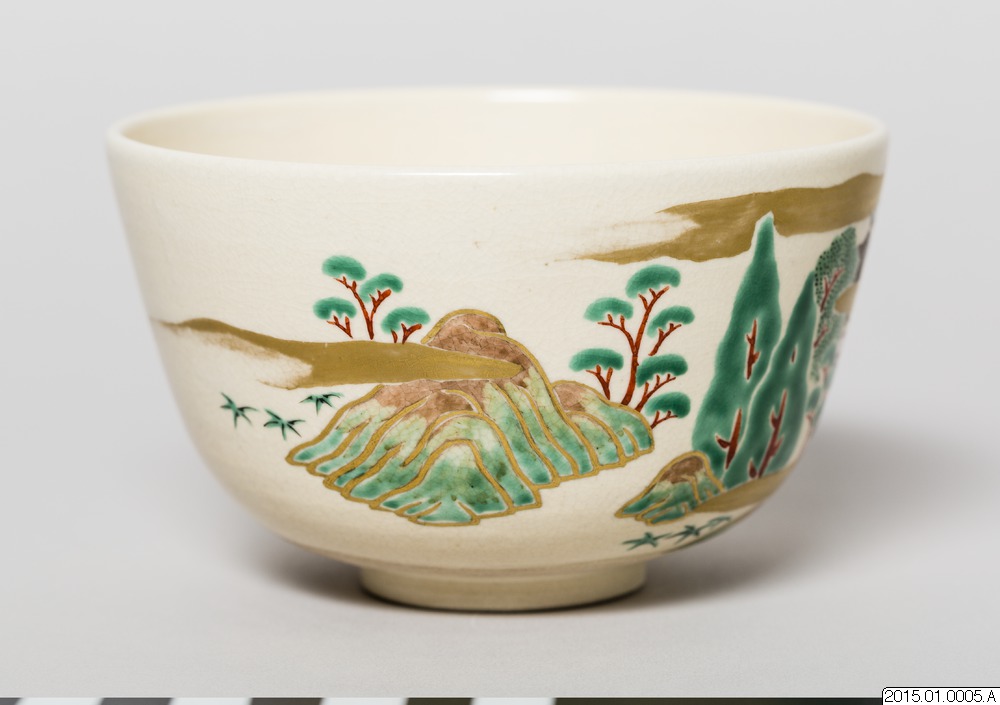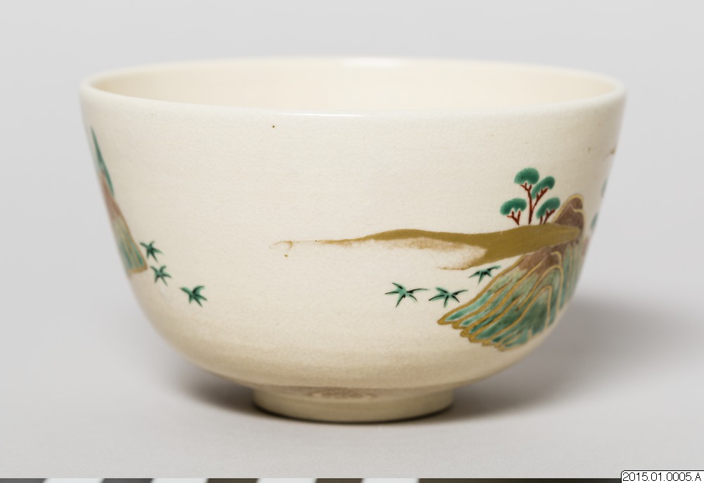 Teskål tillverkad av Eiraku Zengorou.Teskål, med ljus glasyr, dekorerad med ett landskapsmotiv. I botten en stämpel i relief.