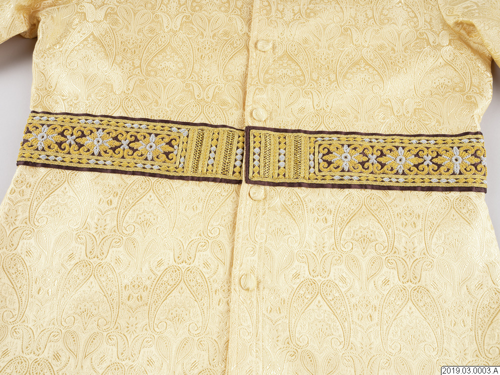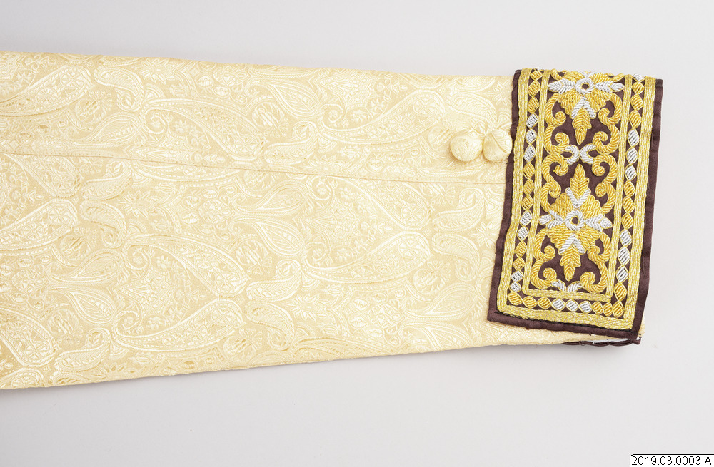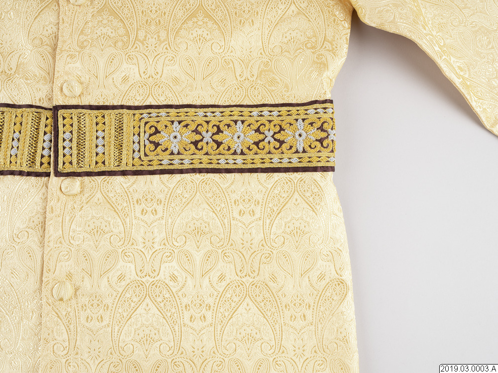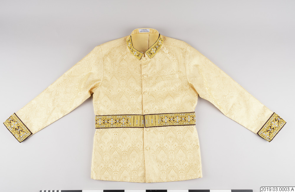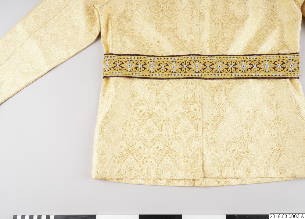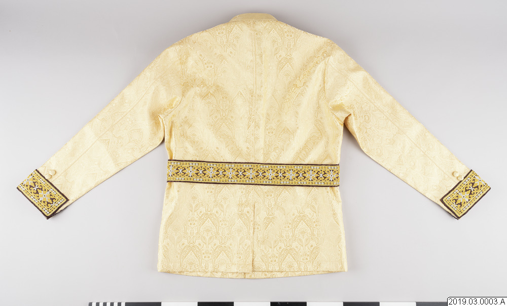 Rak jacka av ljusgult siden med klädda knappar framtill samt vid ärmslut. Ficka på vänster bröst. Fastsydda dekorband av brunt siden med broderier av metalltråd i guld och silver.