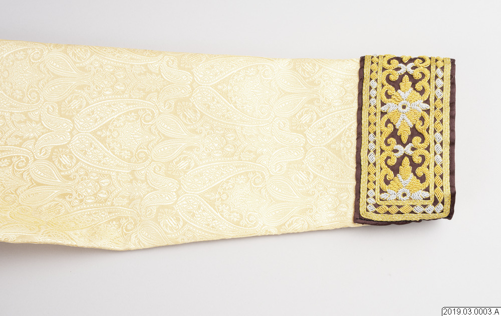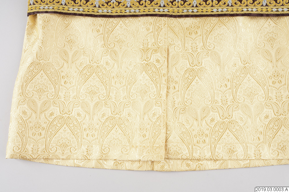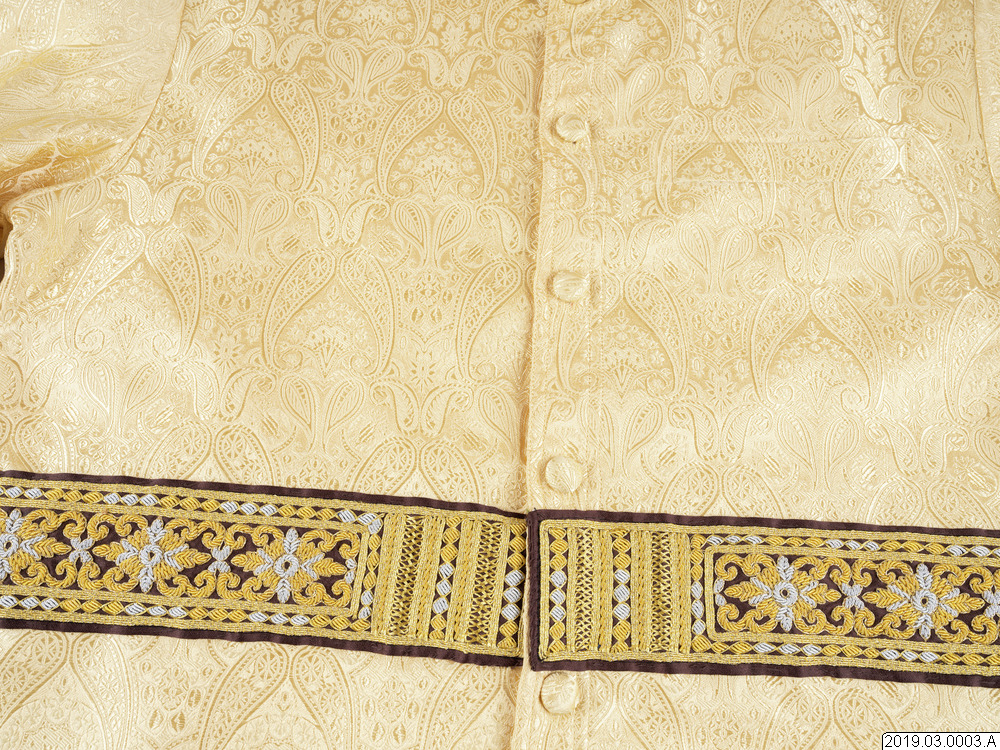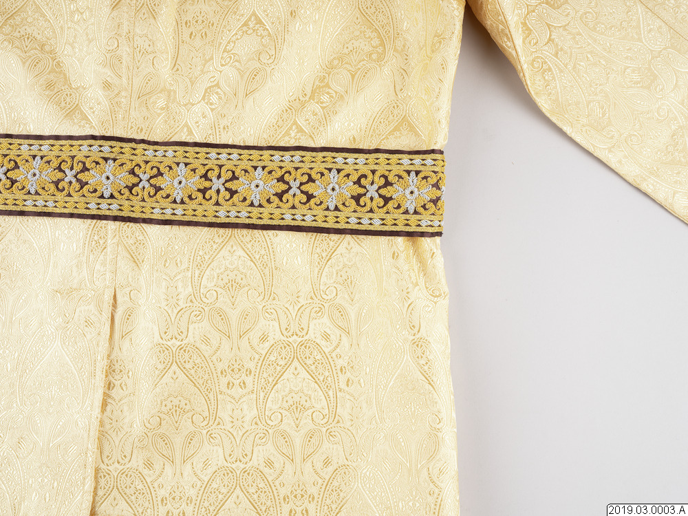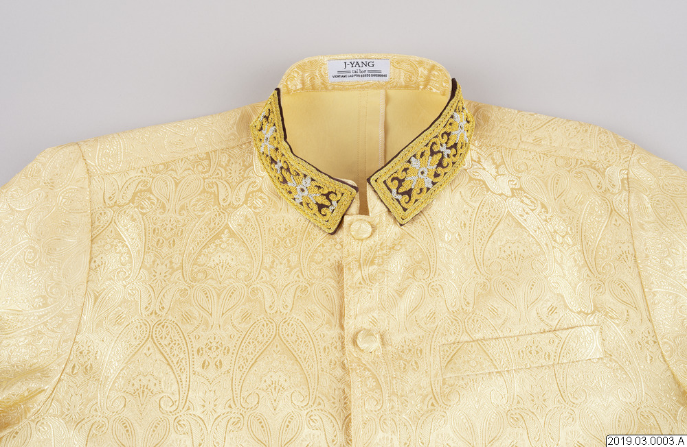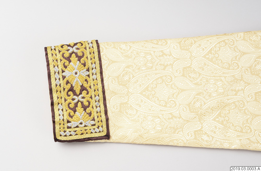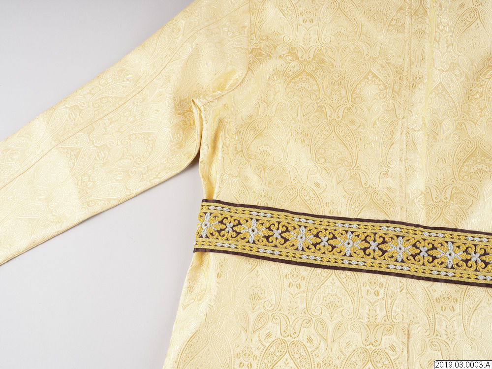 Rak jacka av ljusgult siden med klädda knappar framtill samt vid ärmslut. Ficka på vänster bröst. Fastsydda dekorband av brunt siden med broderier av metalltråd i guld och silver.