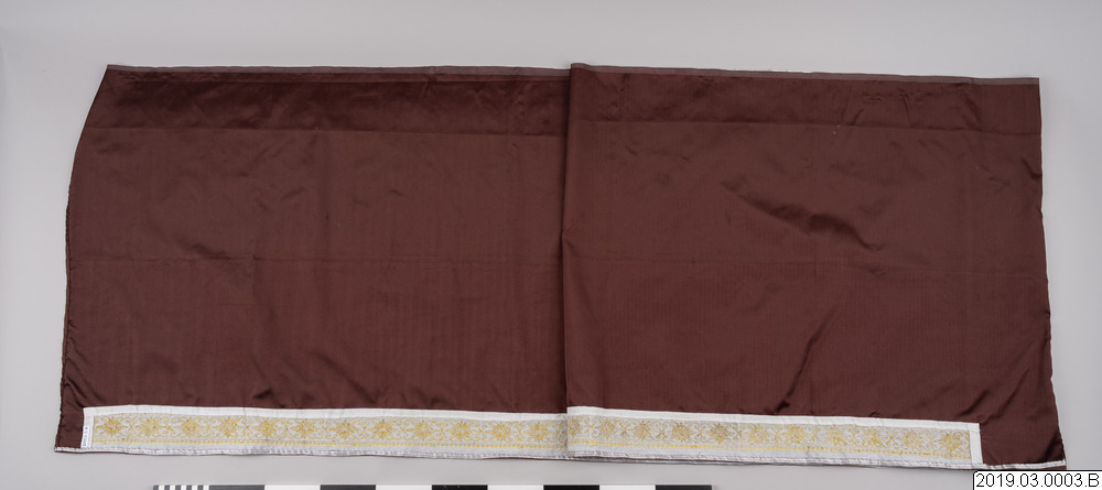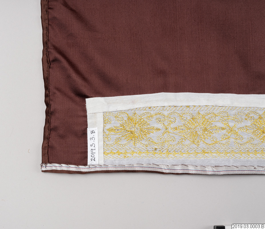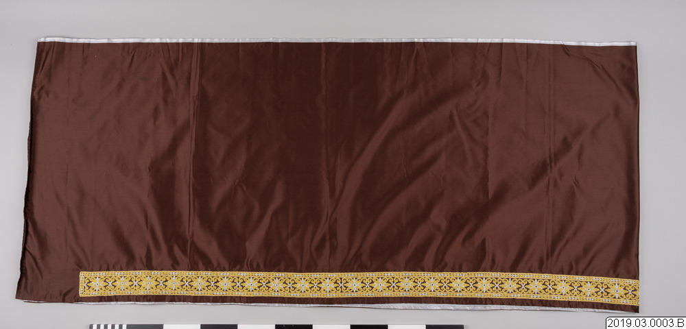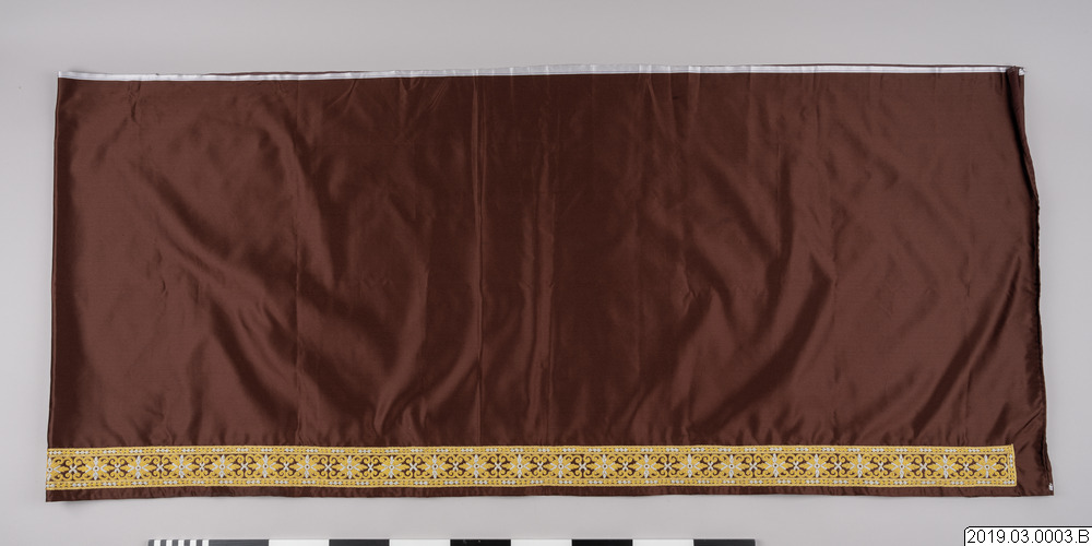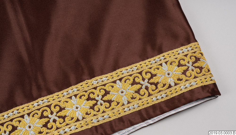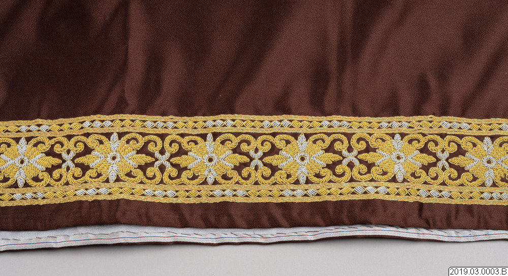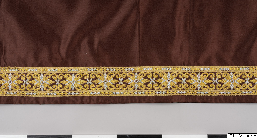 • Underdelen av brunt siden med broderier av metalltråd i guld och silver.