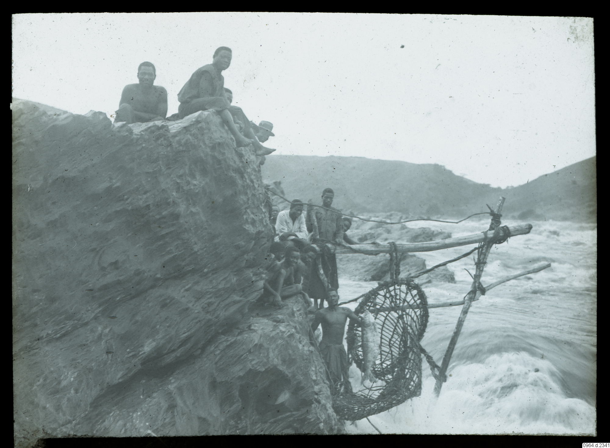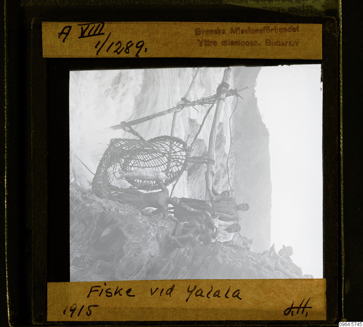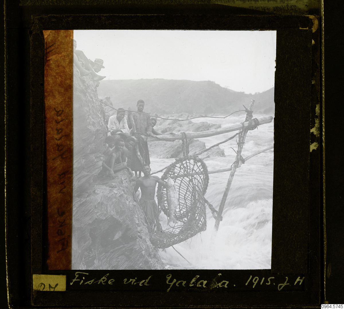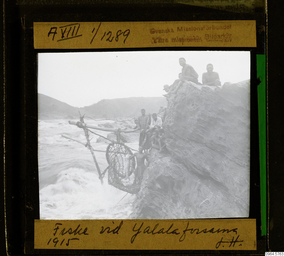 Fiskare vid Yalala-fallen. Fällor och luckor används som metod vid fiske. Används än i dag. Här fiskar man vid Yalala- fallen.