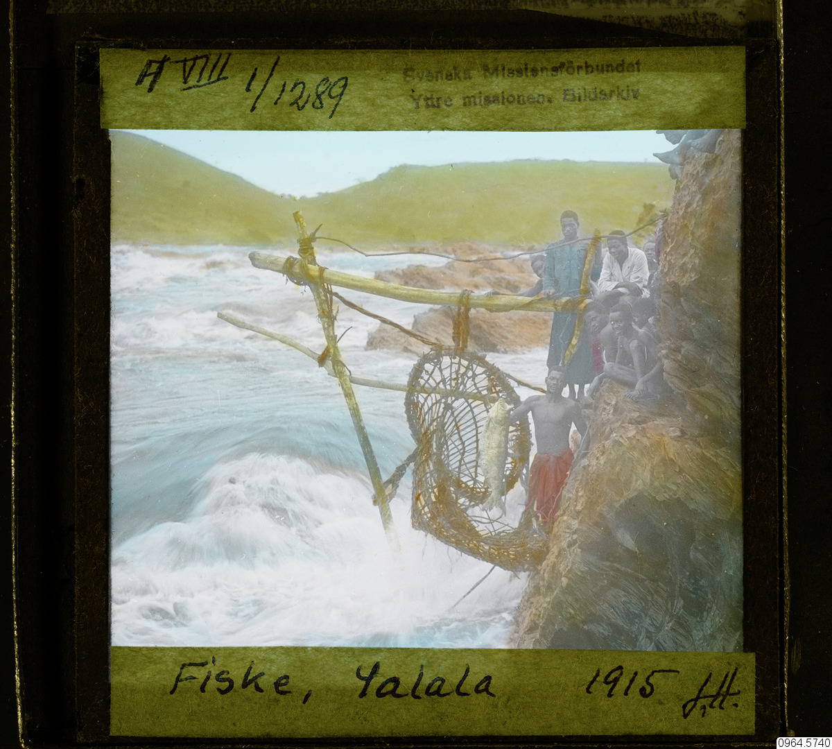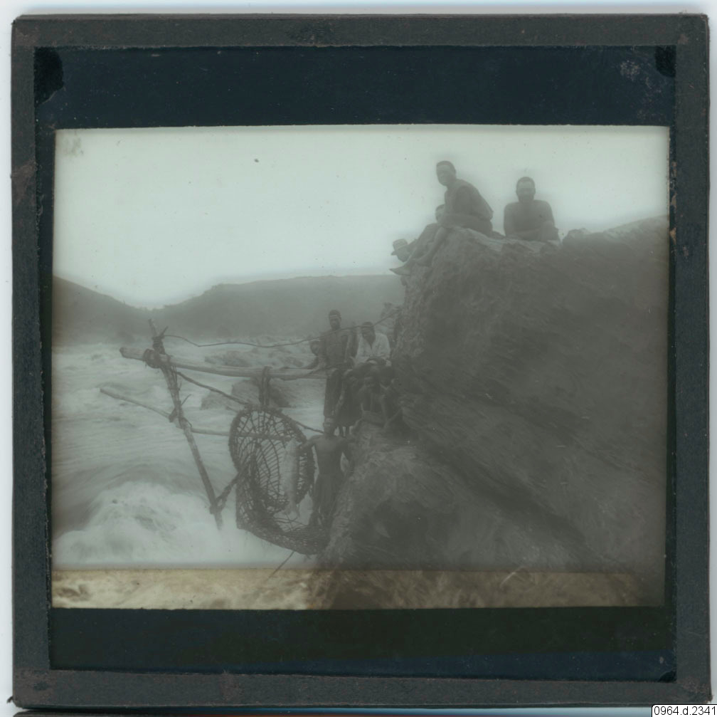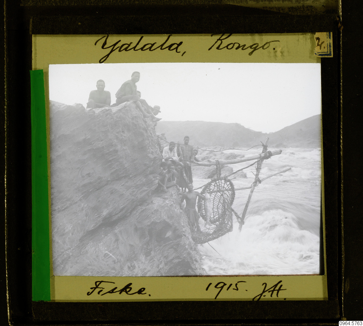 Fiskare vid Yalala-fallen. Fällor och luckor används som metod vid fiske. Används än i dag. Här fiskar man vid Yalala- fallen.