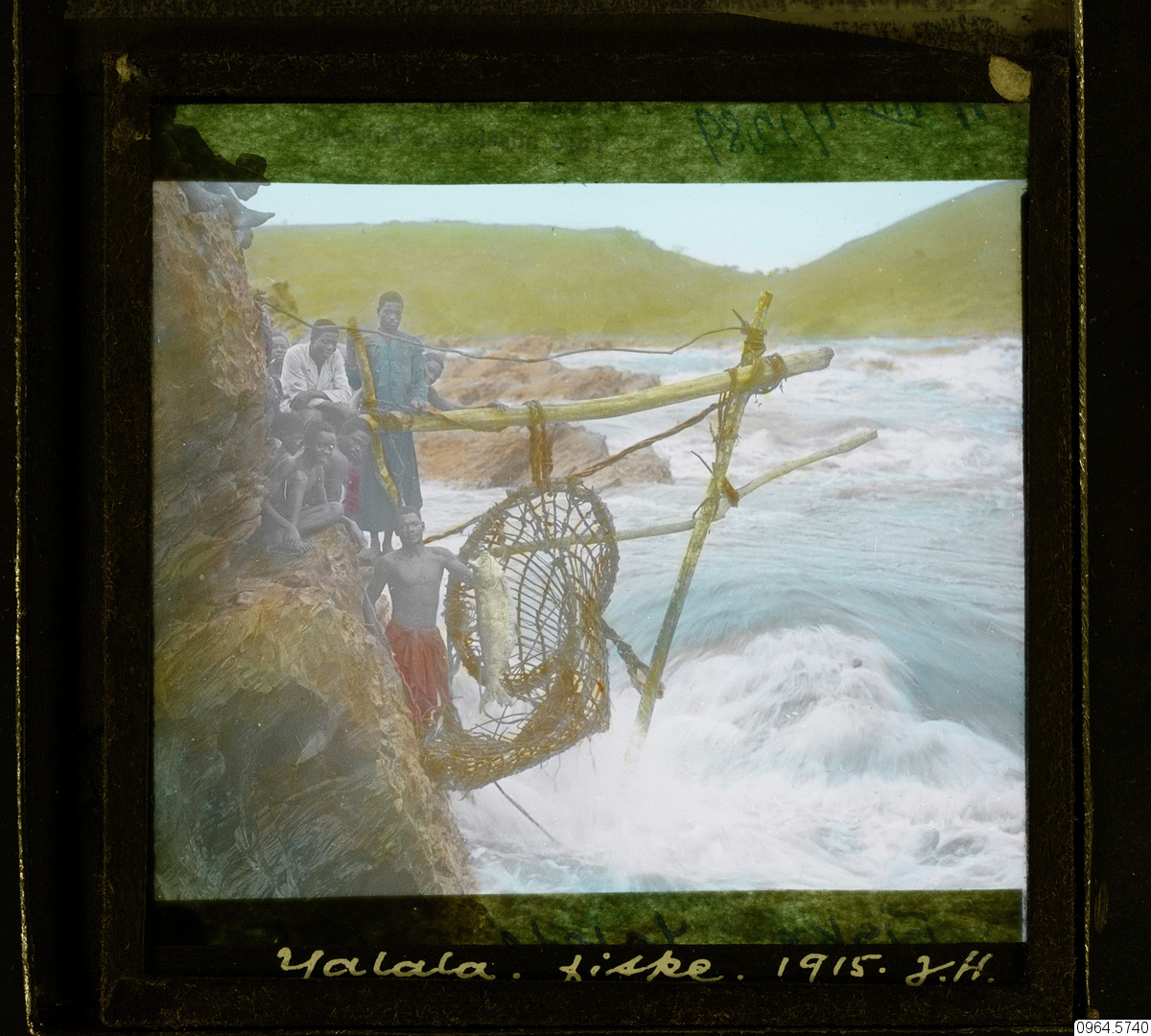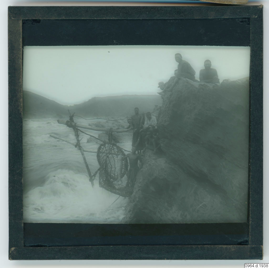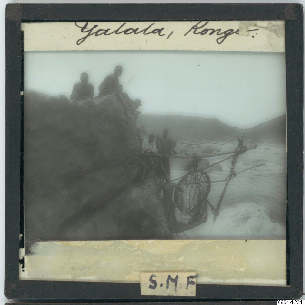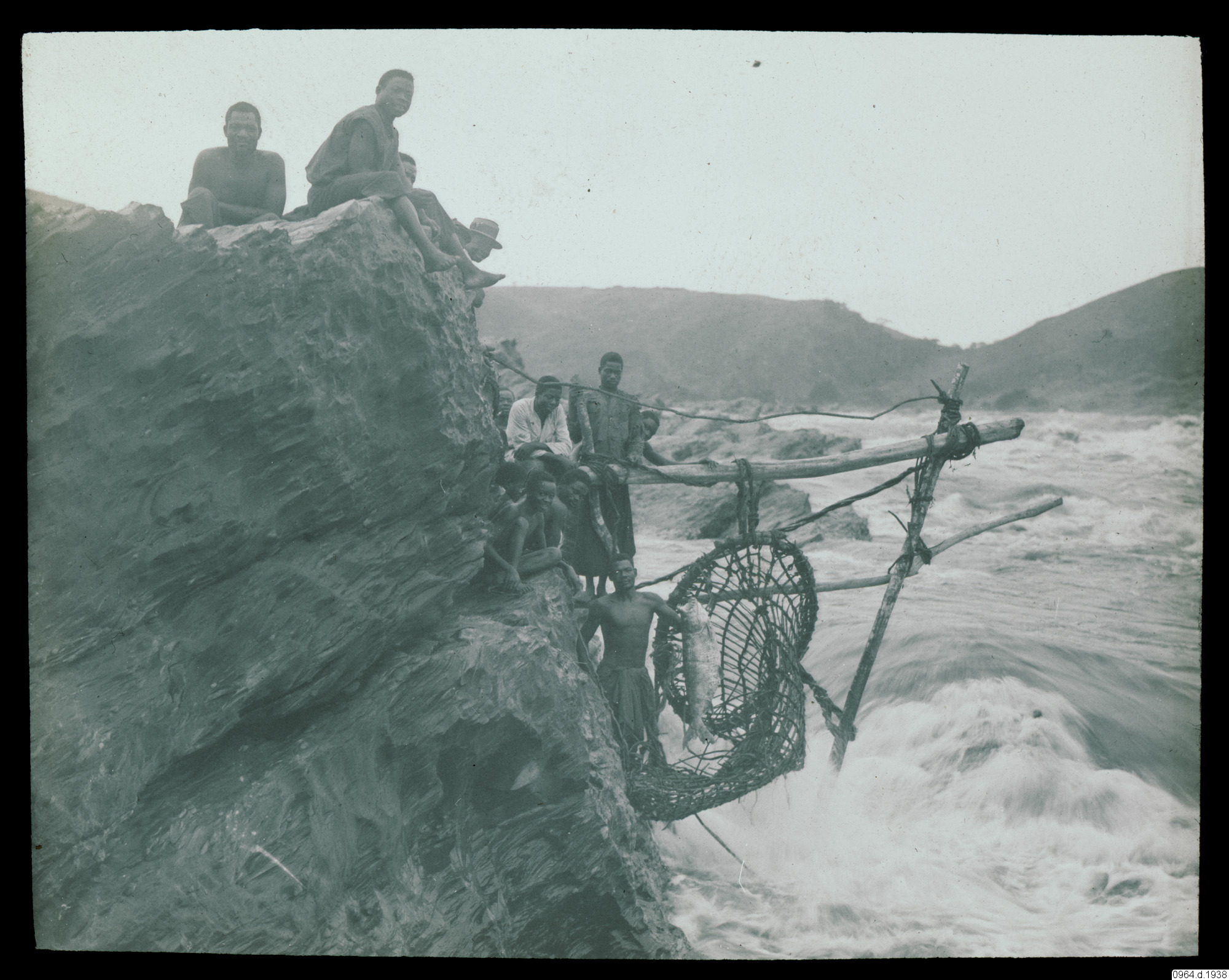 Fiskare vid Yalala-fallen. Fällor och luckor används som metod vid fiske. Används än i dag. Här fiskar man vid Yalala- fallen.