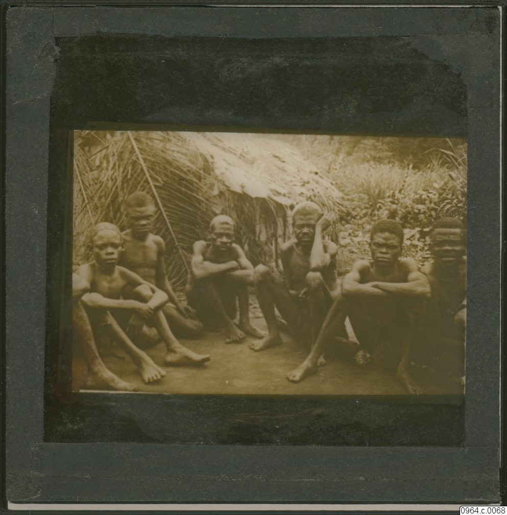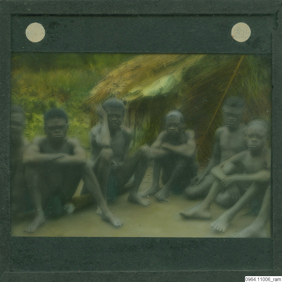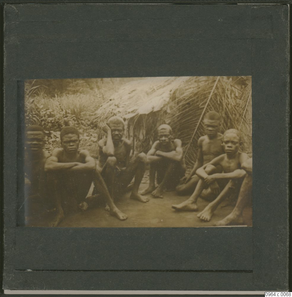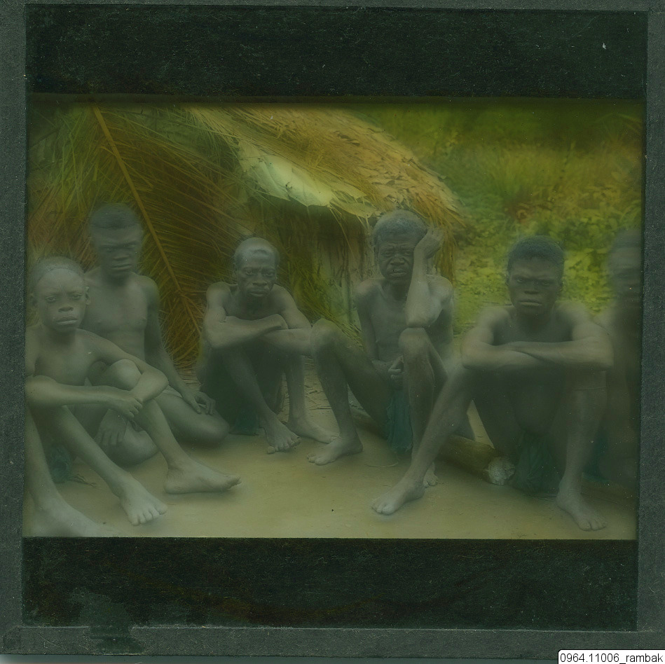 Trakten av Sibiti. 1925. Babongo (pygméer). - Far och son, hemkomna från en misslyckad jakt. Villebrådet börjar tryta. (Manker, Ernst, 1929, Bland Kristallbergens folk, Stockholm, s. 59). Livet mest allvar (bildtext).