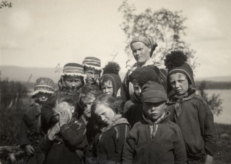 Nomadskolan; lärarinnan och barnen. Foto: okänd. Vaisaluokta. Jokkmokk s:n. Gåva av Ernst Manker. 1933. Nomadlärarinnan: Stine Isaksson (f. Kemi). Barnen, bakre raden fr. v.: 1. Inger Anna Omma, 2. Margareta Nutti, 3. Elli Hurri, 4. Paulus Utsi, 5. Henrik Blind, 6. Nikolaus Utsi; främre raden fr. h.: 7. Jon Omma, 8. Anni Nutti, 9. Anni Hurri, 10. Elli Nutti. 4. o. 6. bröder. Samtliga karesuandolappar.