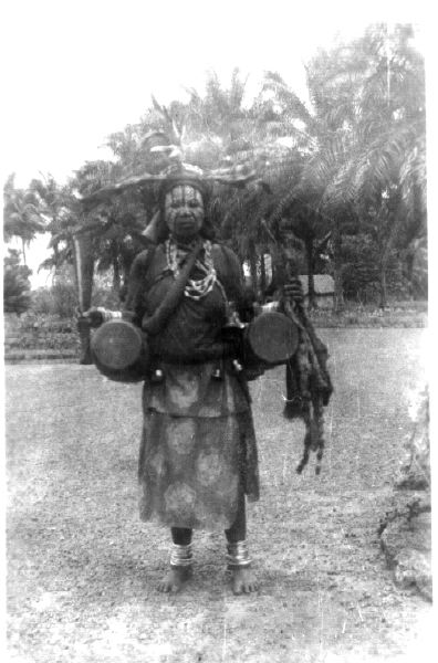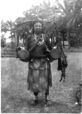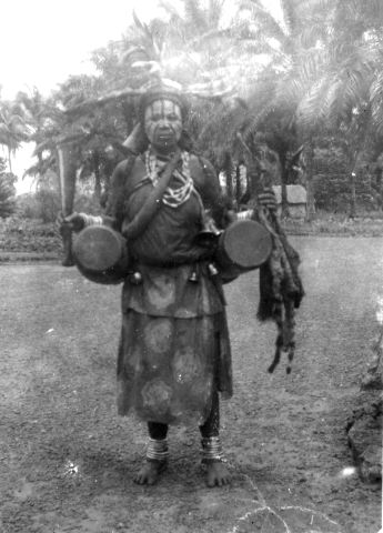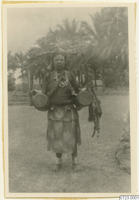 • Kità-kvinna (Kità, en ukisi som bor i vattnet. Vattenande). I högra handen en dubbel klocka av järn. Två trummor. Moyen Congo. Franska Ekvatorialafrika. Från trakterna av Indo missionsstation. Stadsport Sihuti.