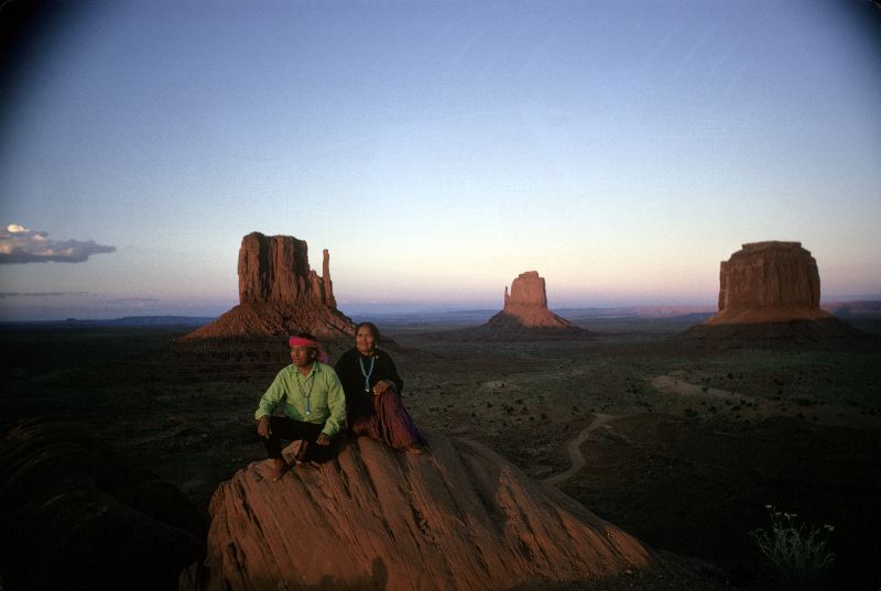 Marianne besökte navajoindianerna i sydvästra USA flera gånger, ofta i sällskap av Harry Goulding eller Raymond Friday Locke, själv av indiansläkt och historiker, till vars bok hennes bilder användes som illustrationer. Fotografiet visar två personer i solnedgången över Monument Valley i Navajoland.
