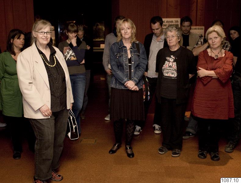 • Vernissage, Med världen i kappsäcken, Mjöberg. Gäster och personal lyssnar på museichef Anders Björklund.