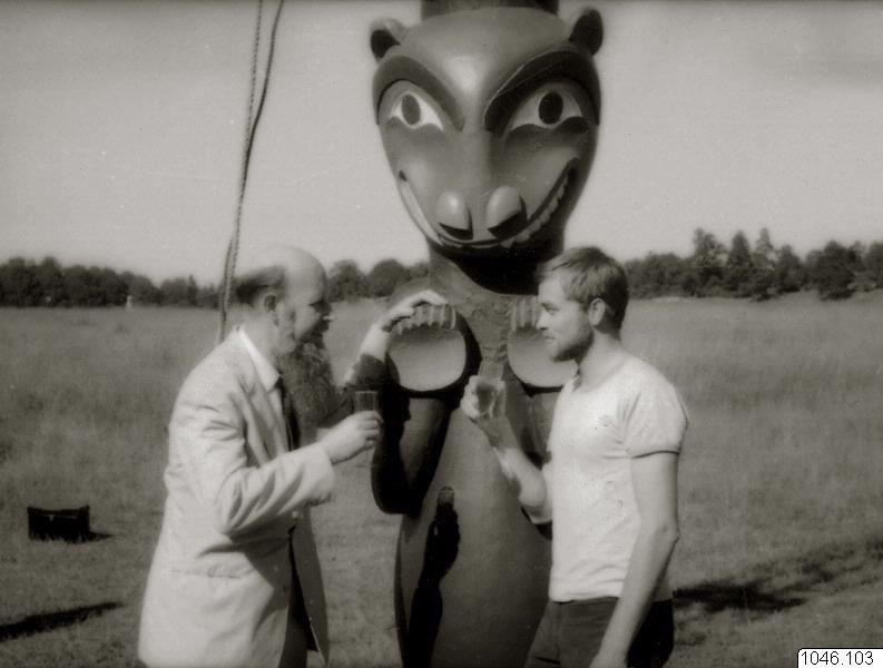 Resning av kopia av totempålen som gjordes av två studer från Konstfack. Platsen är Gärdet, Stockholm, troligen 1969. Pålen var målad. Den togs sedan ner i början av 1980-talet på grund av rötskada. På bilden syns Bengt Danielsson och en av studenterna, Karl Johan Ingemar Jonsson.