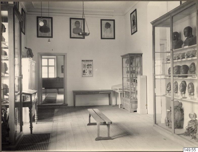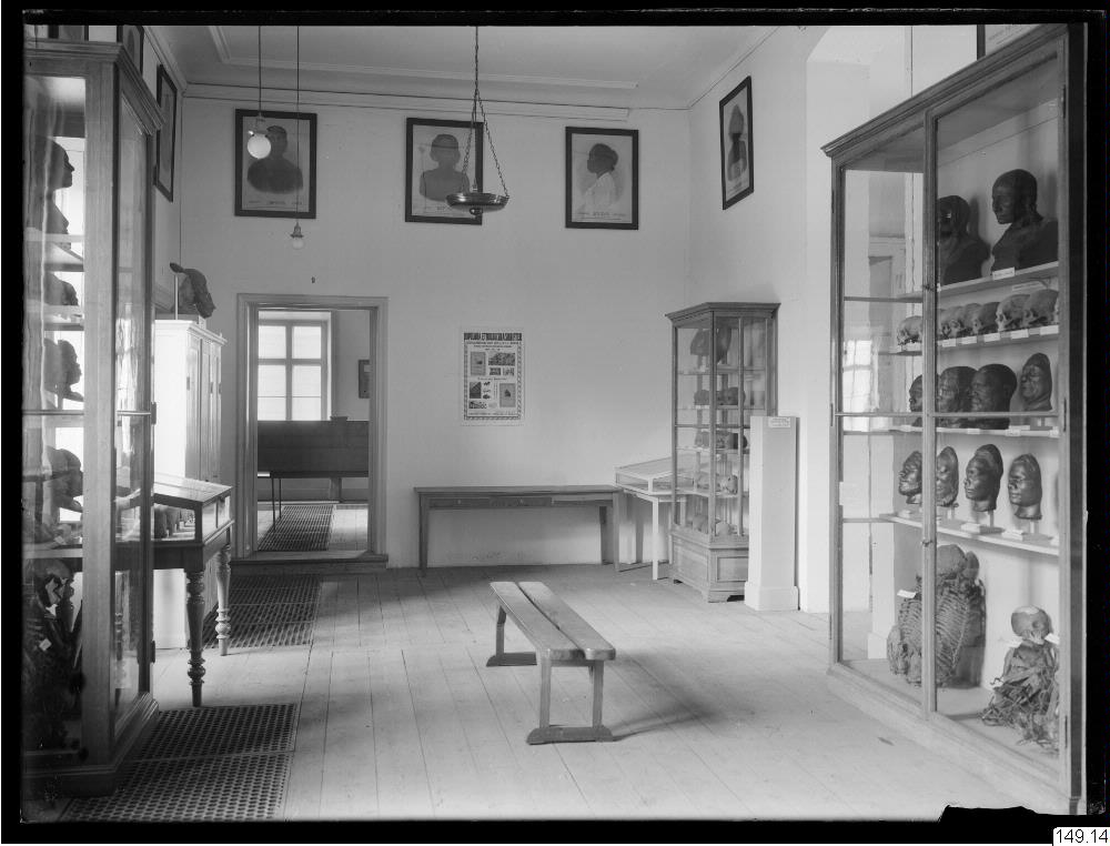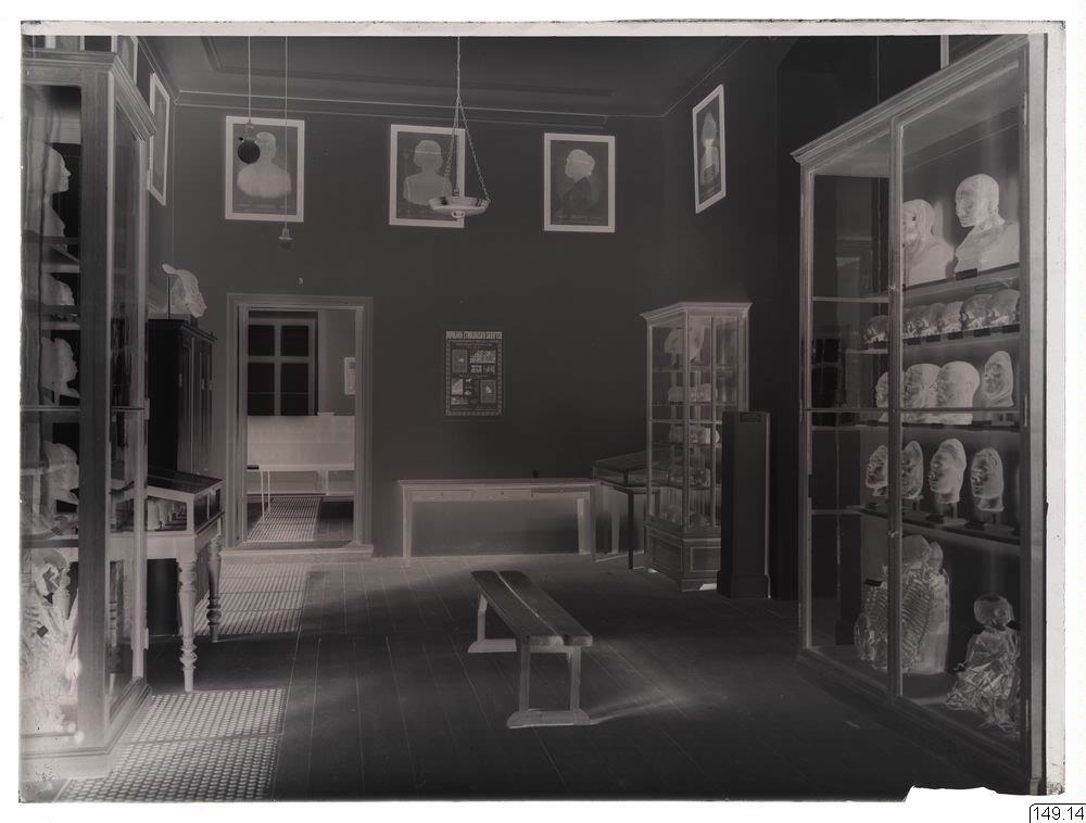 Riksmuseets etnografiska avdelnings nya utställning 1917. Antropologiska salen. Stockholm. Vallingatan 2. Foto: Oscar Ellquist, Sthlm. (katalogkort) Årtalet "1926" på katalogkortet anger troligen när katalogkortet upprättades.