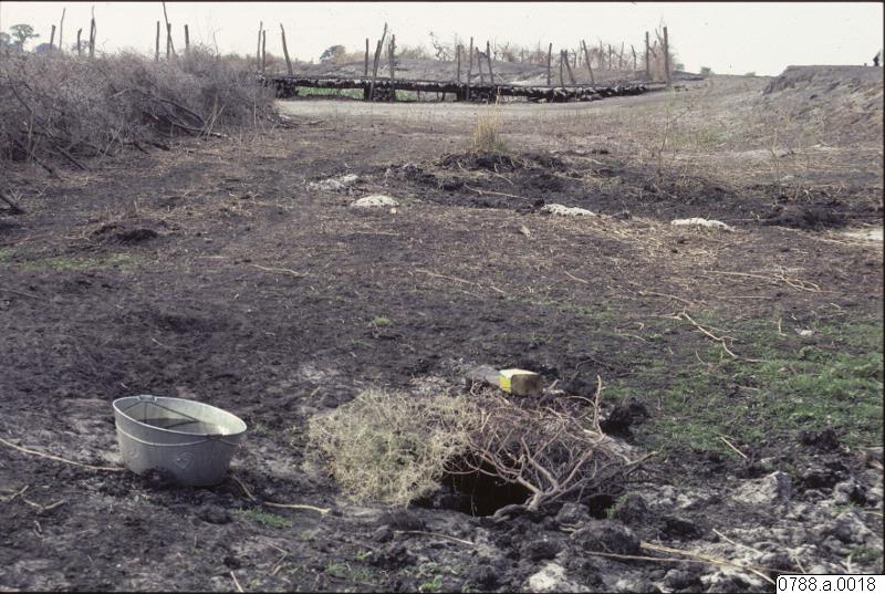 Vattenhål, en brunn grävd i en uttorkad flodbädd väster om Gumare. I bakgrunden en träbro som används under översvämningssäsongen.