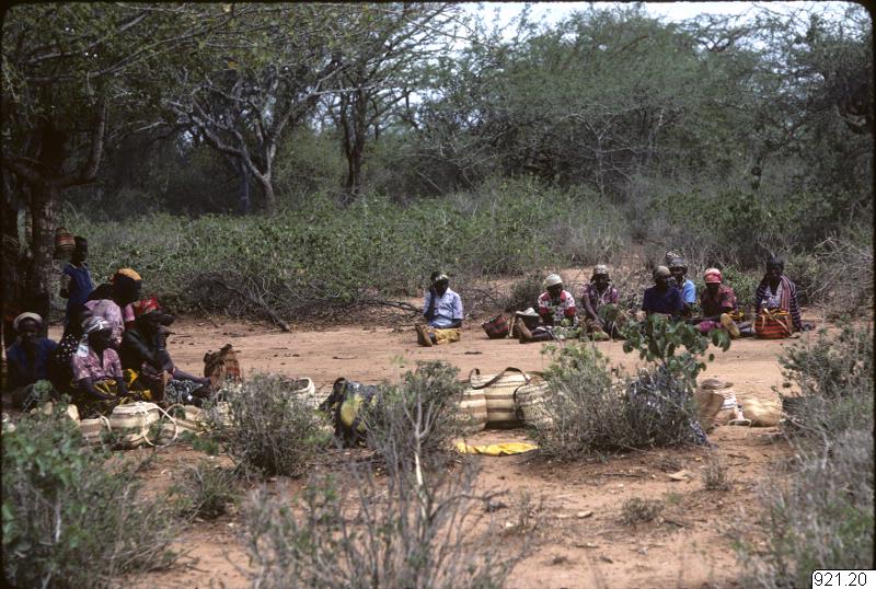 Föremålssamling 1984.8. Kvinnor samlas vid en mötesplats för att sälja korgar till etnografiavdelningen vid National Museums of Kenya och till Etnografiska museet i Stockholm. De flesta korgarna är gjorda av sisalfibrer men några är tillverkade av fibrer från innerbarken på baobabträdet. Denna episod diskuteras i kapitlet ” Acts of Acquisition: Five narratives in collecting for a Museum of Ethnography", kap.4 i East African Contours. Östberg, W. 1984