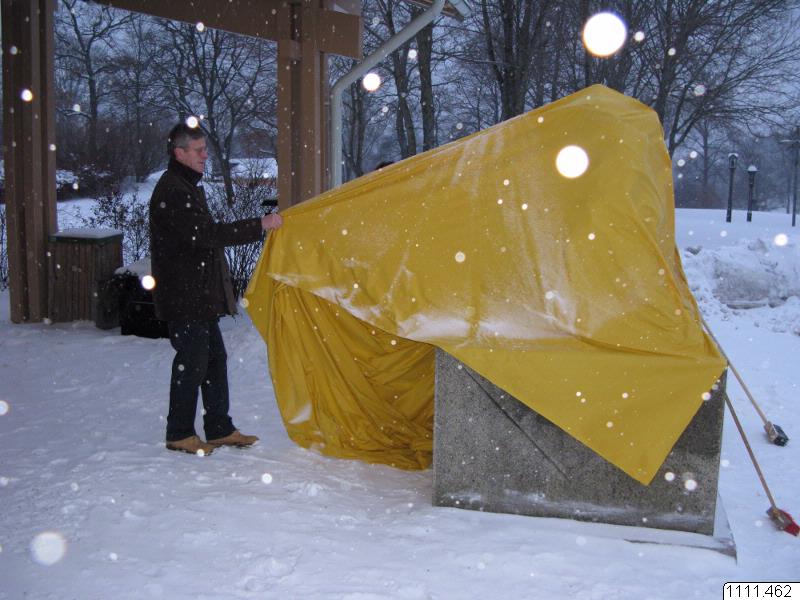 Bild från avtäckningen av kopior av väktarlejonen, 1938.31.0001 och 1938.31.0002. Lejonen har placerats utanför entrén till museet. I samband med avtäckningen talade museichef Anders Björklund, intendent Håkan Wahlquist och Wennberg. Karl Kåa Wennberg drar av skynket.