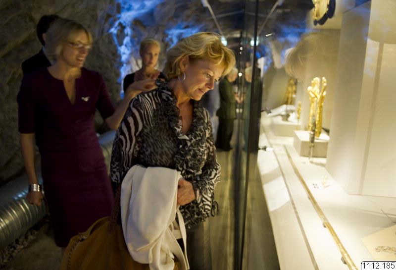 • Dokumentation av vernissage för utställningen Inka - Guldskatter i Bergrummet, 9 september 2011. Överintendent Sanne Houby-Nielsen och kulturminister Lena Adelsohn Liljeroth studerar en av montrarna.