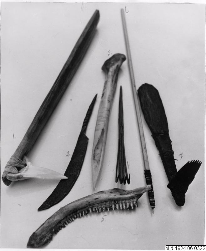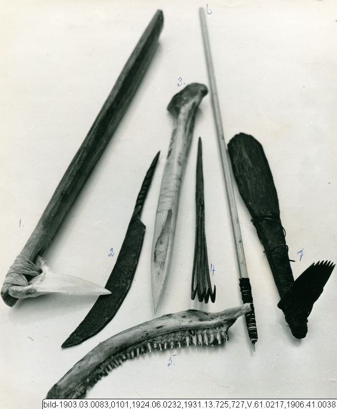 Tatueringsinstrument. 1= 1924.06.0232, 2= 1931.13.0727, 3= 1903.03.0083, 4= 1903.030101, 5= 1931.13.0725, 6= 1887.08.3312, 7= 1906.41.0038