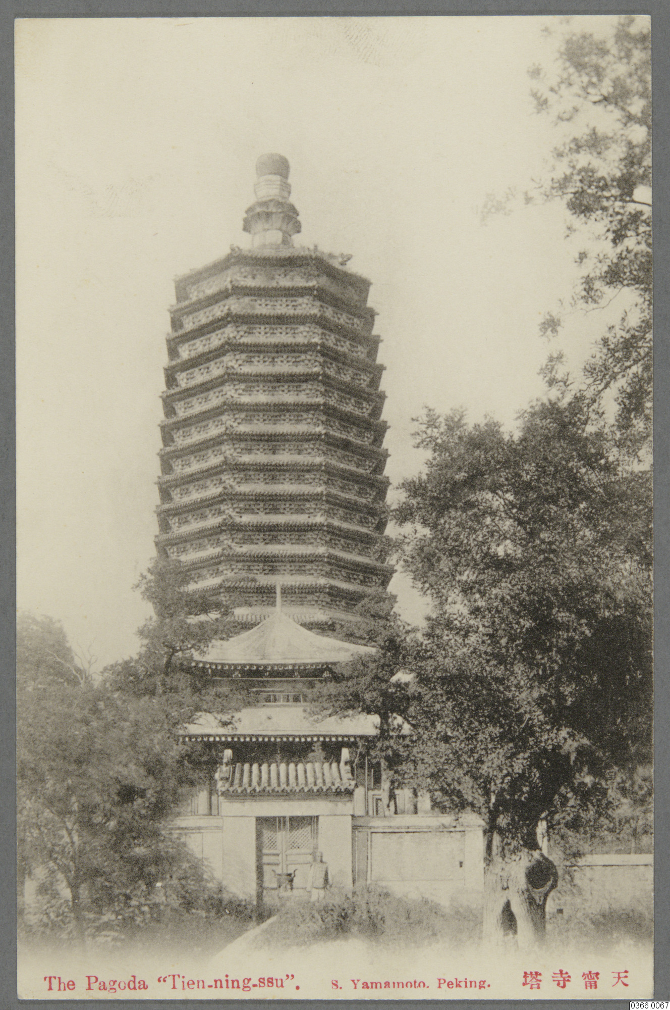 Vykort med motiv av pagodbyggnad, ståendes framför mur med port, träd runtom. Pagodbyggnaden Tieng-Ning-Szu nära Peking, Kina. Text på framsida: "The Pagoda "Tieng-ning-ssu". S. Yamamoto. Peking." Text på baksida: "Union Postale Universelle. CARTE POSTALE."