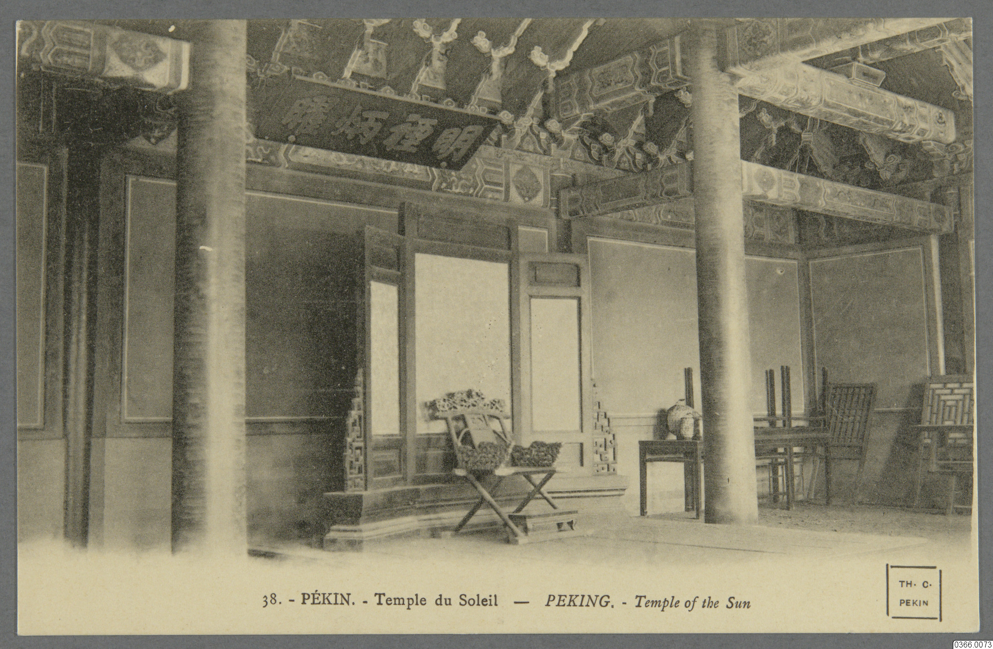 Vykort med motiv av insidan av ett rum, en stol står i centrum av rummet framför en skärm, båda med ihåliga mönster längs kanterna, möbler i bakgrunden, stolpar som bär upp taket i förgrunden, detaljrika paneler i takdelen; del utav Solens tempel - en av fem kända altare i Peking, Kina. Text på framsida: "38. PÉKIN. - Temple du Soleil - PEKING. - Temple of the Sun." Text på baksida: "CARTE POSTALE, CORRESPONDANCE, ADRESSE."